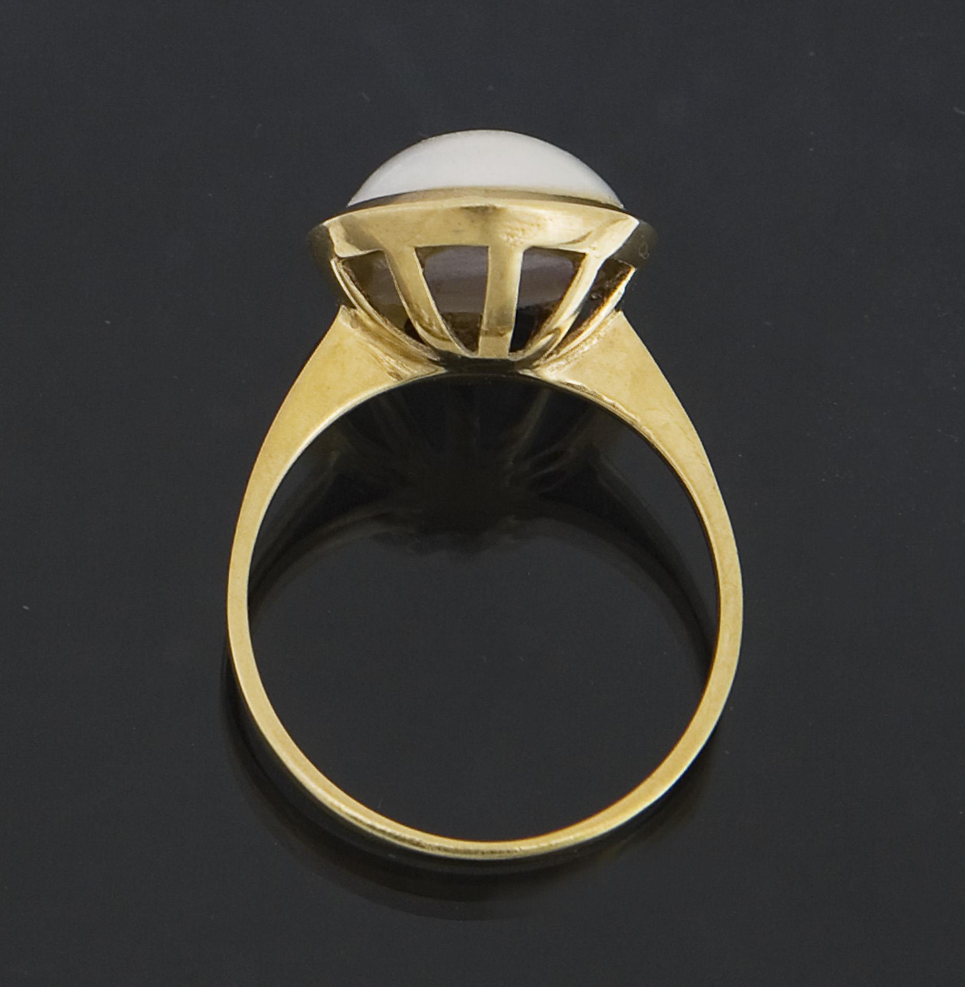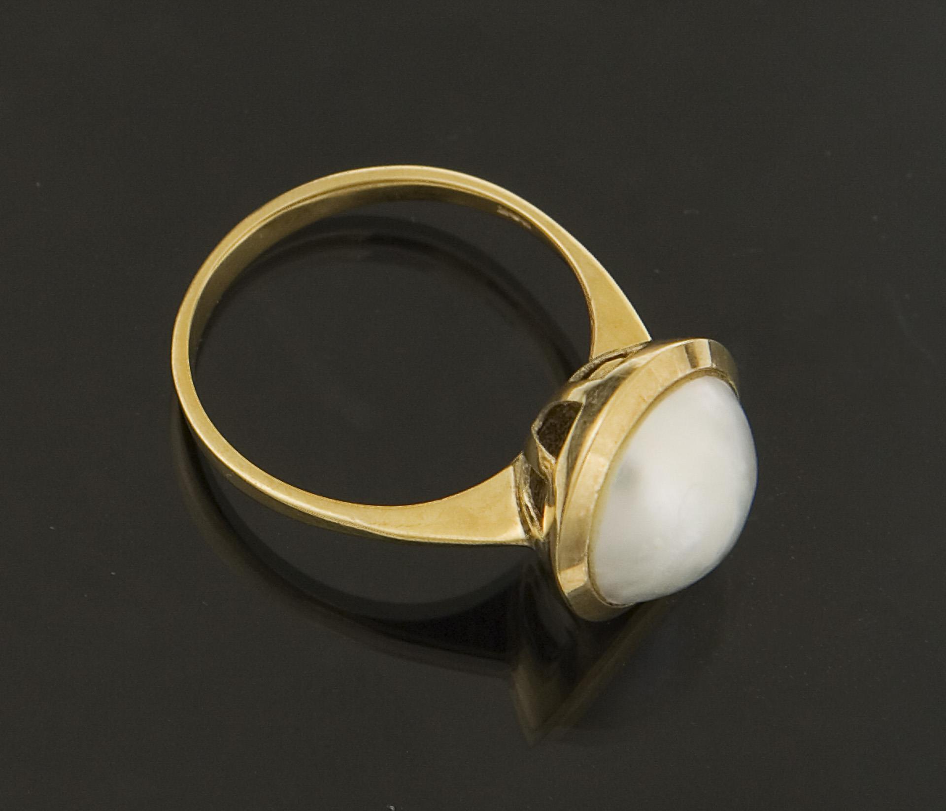 Mabe-Zuchtperle ø 11,5 mm, gewölbte, durchbrochen gearbeitete Form, schmale stabile Schiene. Punzen: Feingehalt. Perle partiell fleckig.