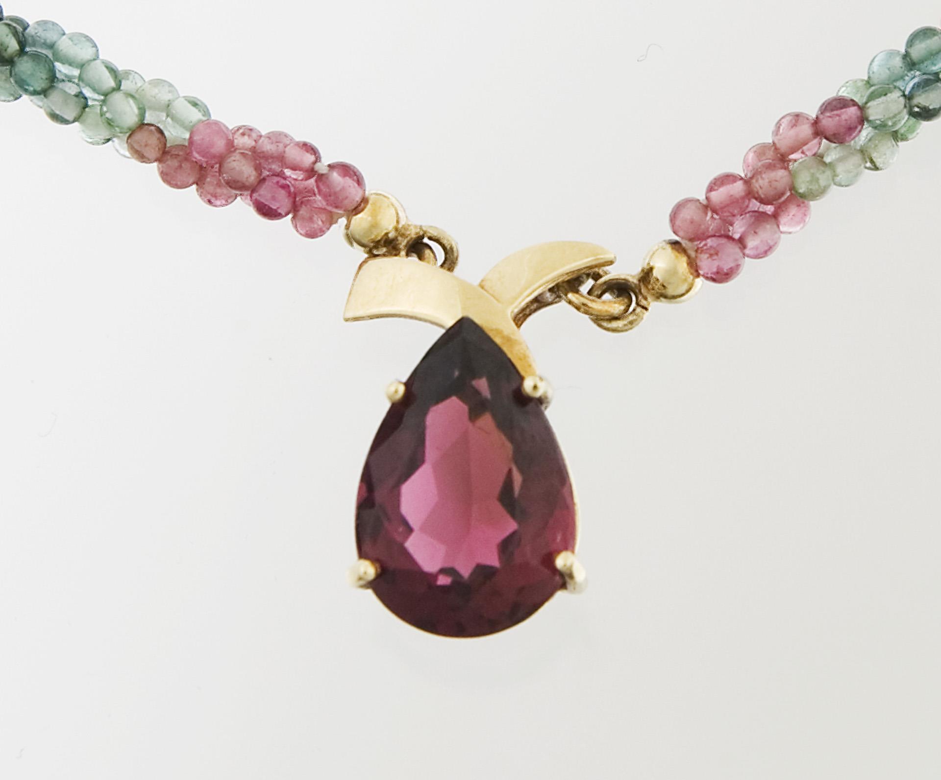 Violetter facettierter Turmalin in Krappenfassung, Multicolor Kordelkette mit kleinen Schmuckstein-Rondellen, Karabiner-Schließe, Punzen: Feingehalt.