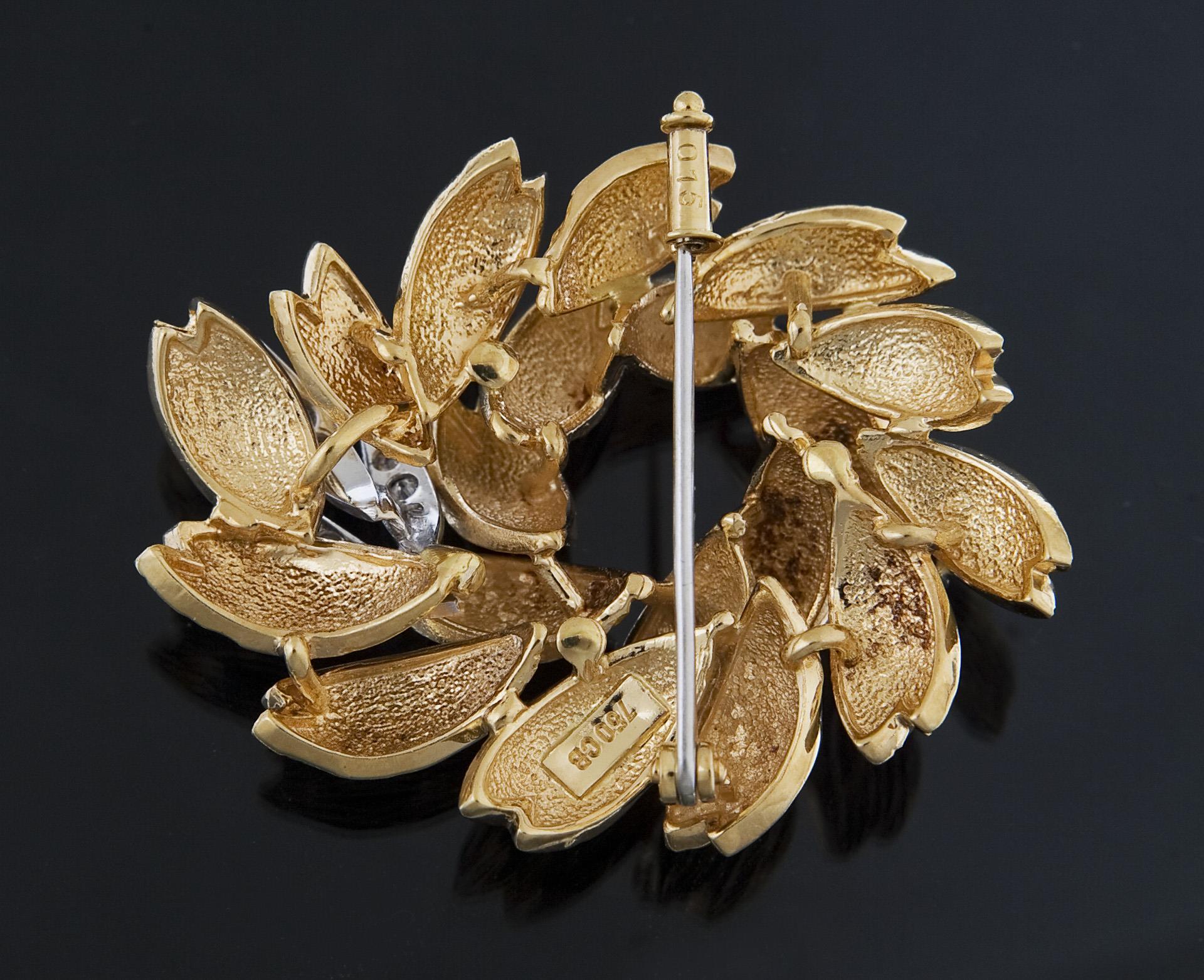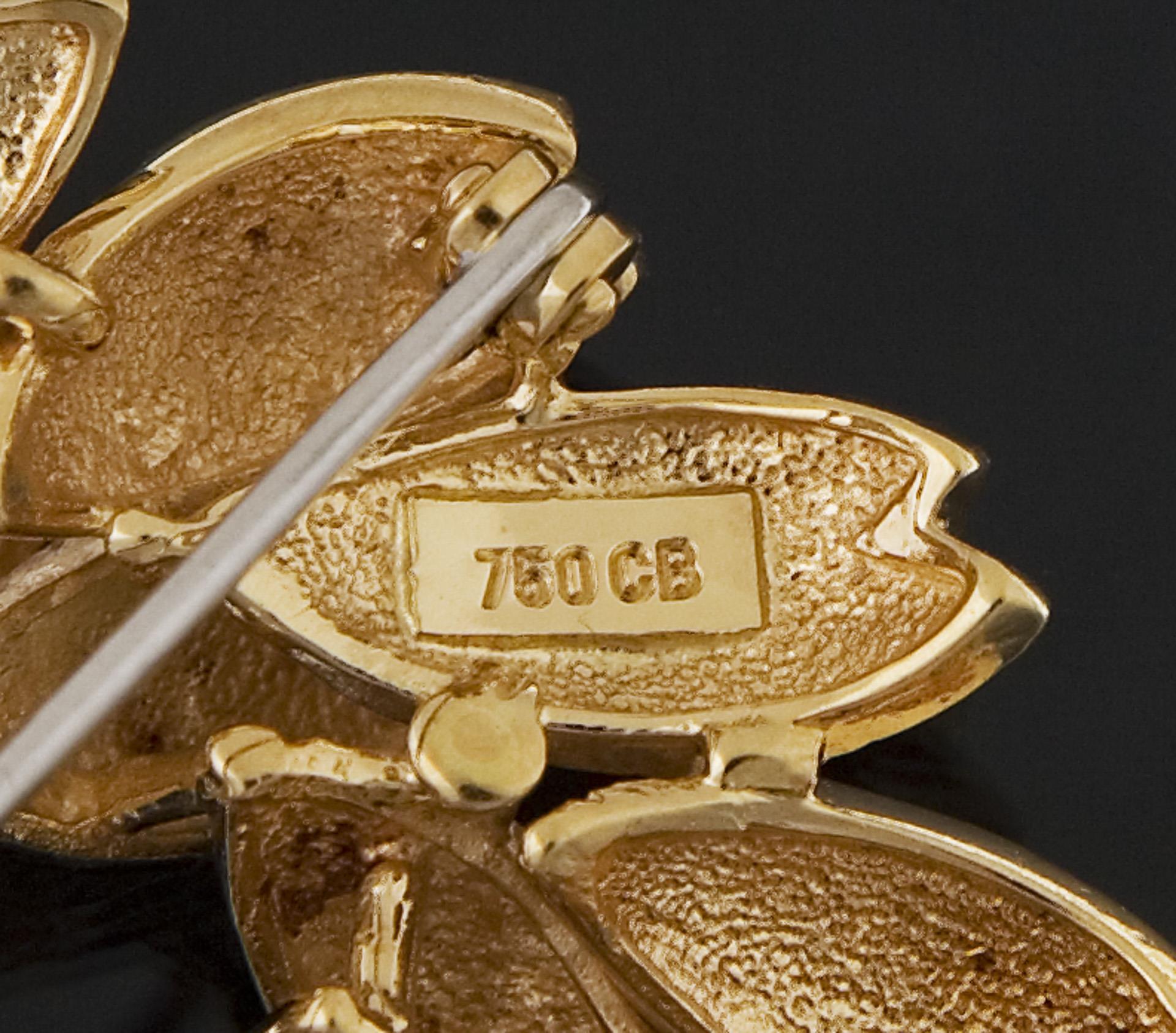 11 kleine Diamanten, 3 kleine Rubine, massiv gearbeitet, florales Design, Punzen: Feingehalt, Juweliermarke CB.