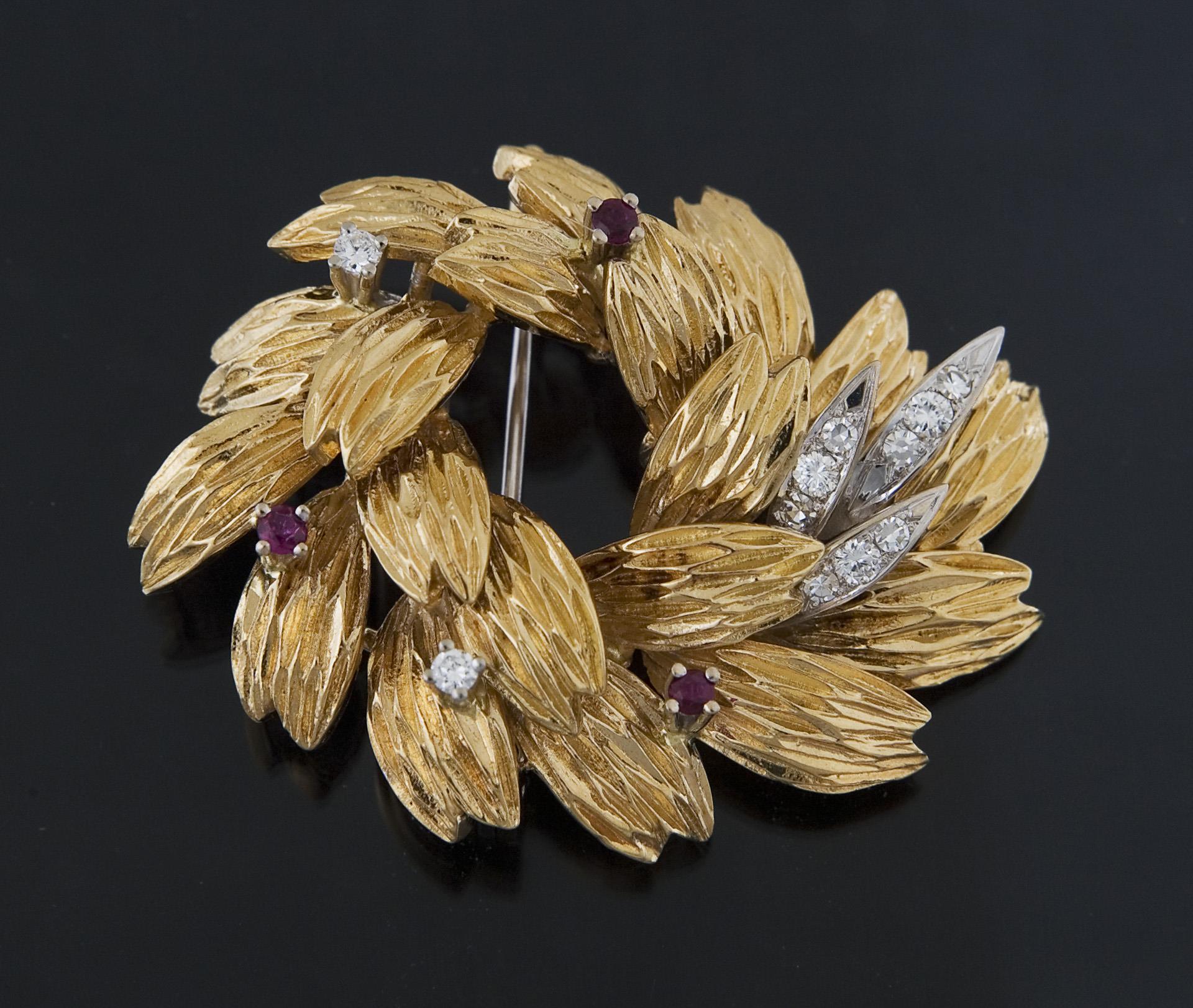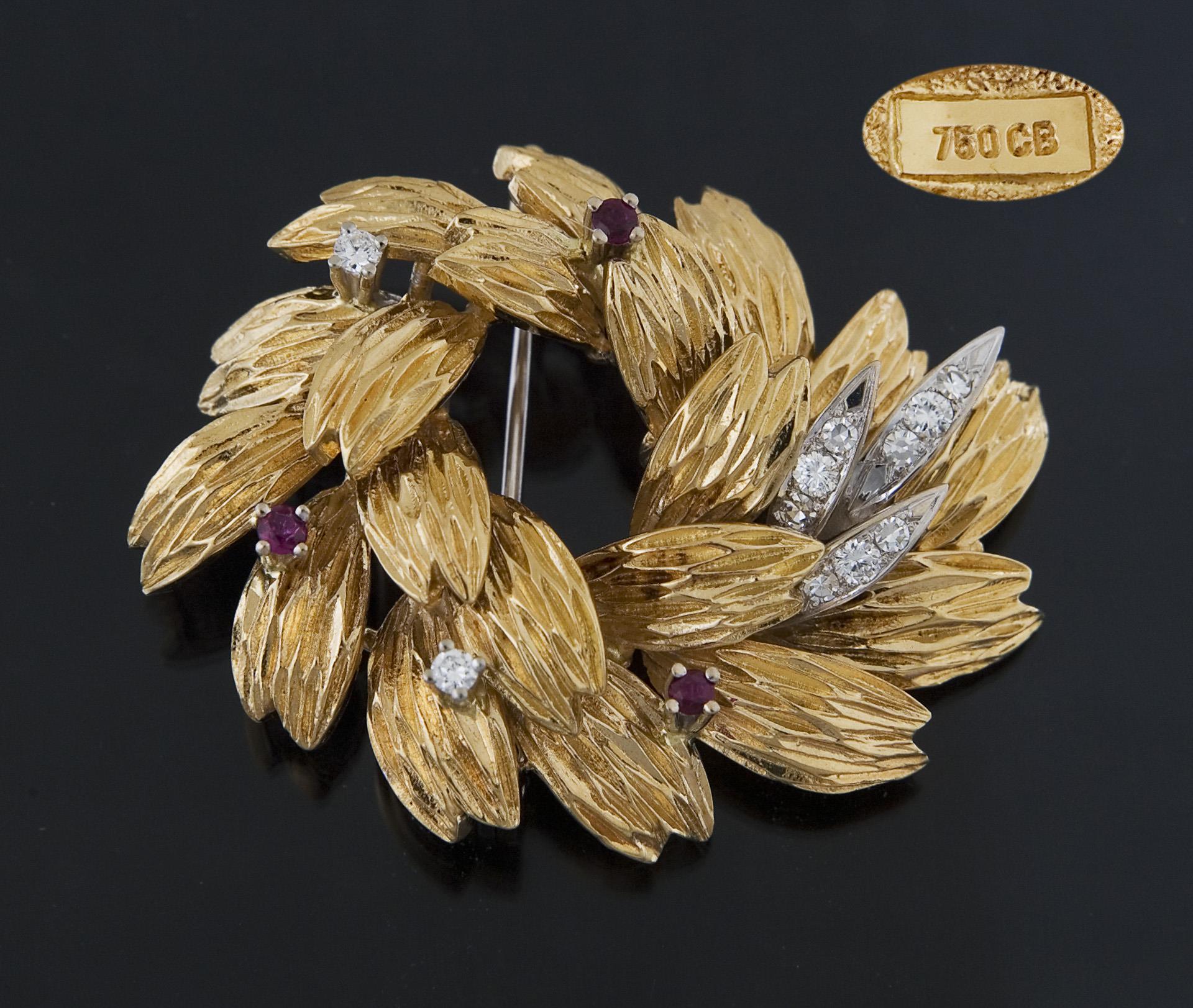 Gold-Brosche mit Rubinen und Diamanten. Carl Bucherer.
