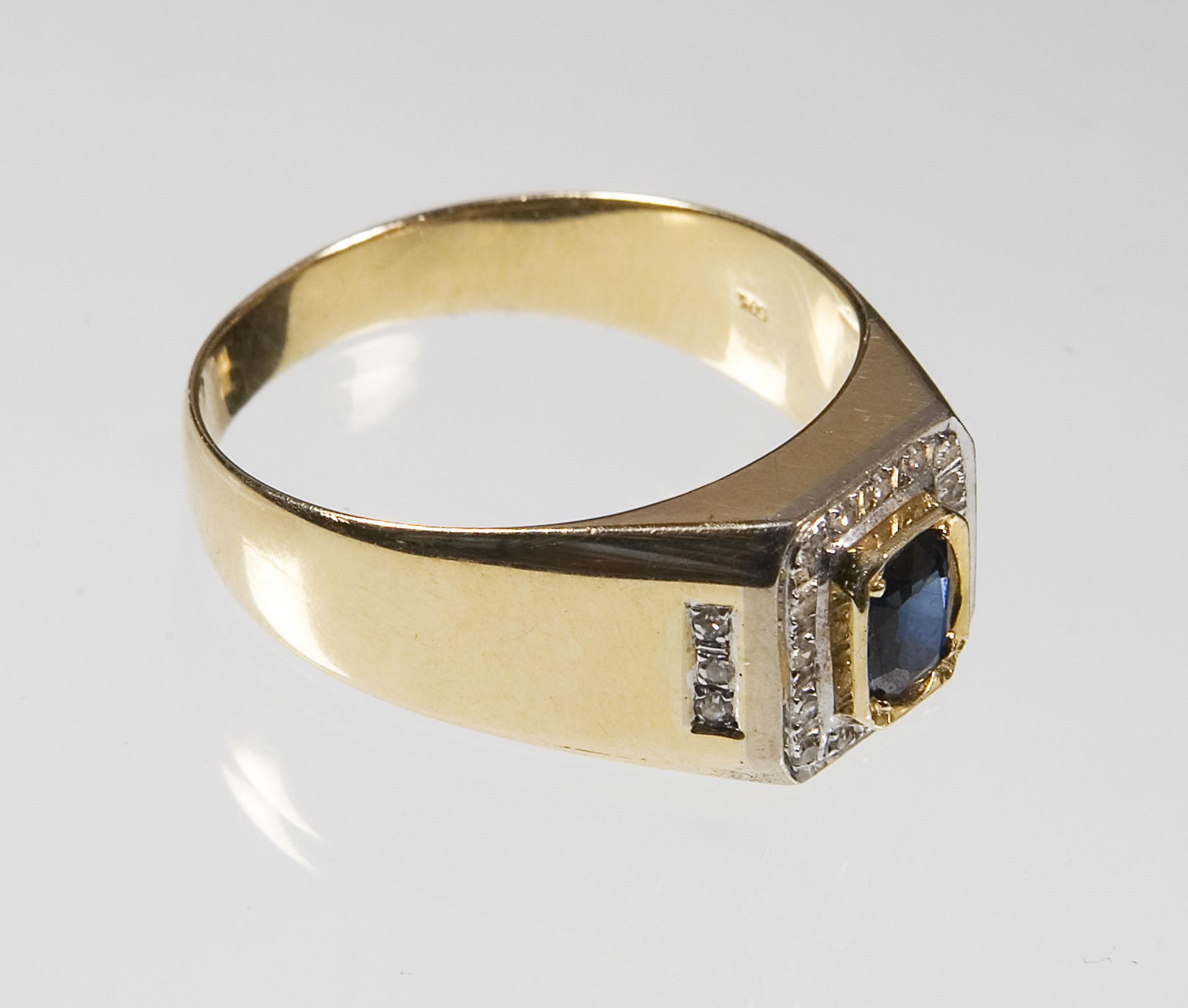Ovaler facettierter Saphir circa 6 x 4,5 mm, umlaufend und seitlich 22 kleine Diamanten. Breite stabile Schiene, Punzen: Feingehalt.