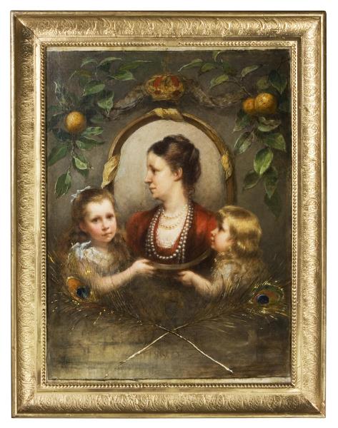 Zwei blondgelockte Mädchen halten das gerahmte und bekrönte Profilbildnis vermutlich ihrer Mutter. Die Orange ist ein Symbol für Fruchtbarkeit und Lebensfreude, der Pfau gilt als Symbol für Herrschertum und Schönheit. Vergoldeter Stuckrahmen. Doubliert.