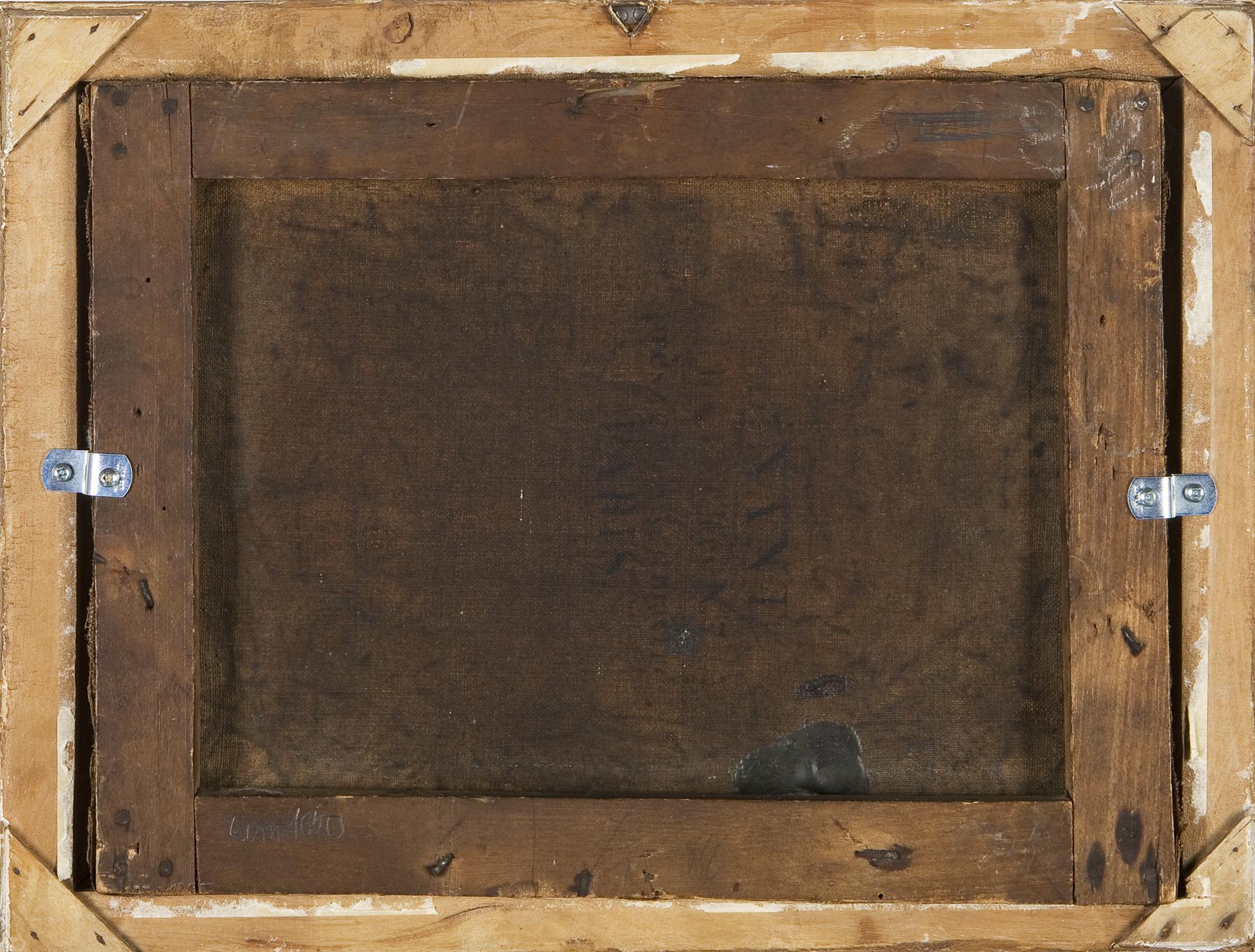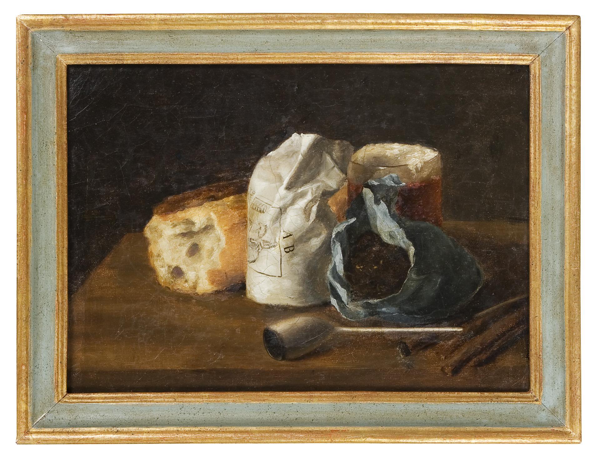 Ein qualitätvolles und kompositionell kraftvolles Küchenstillleben. Die einfachen Dinge des täglichen Lebens sind mit Wirklichkeitssinn in feiner Malerei in Szene gesetzt. Rückseitig Pariser Stempel, neuwertiger profilierter Rahmen. Craquelé.