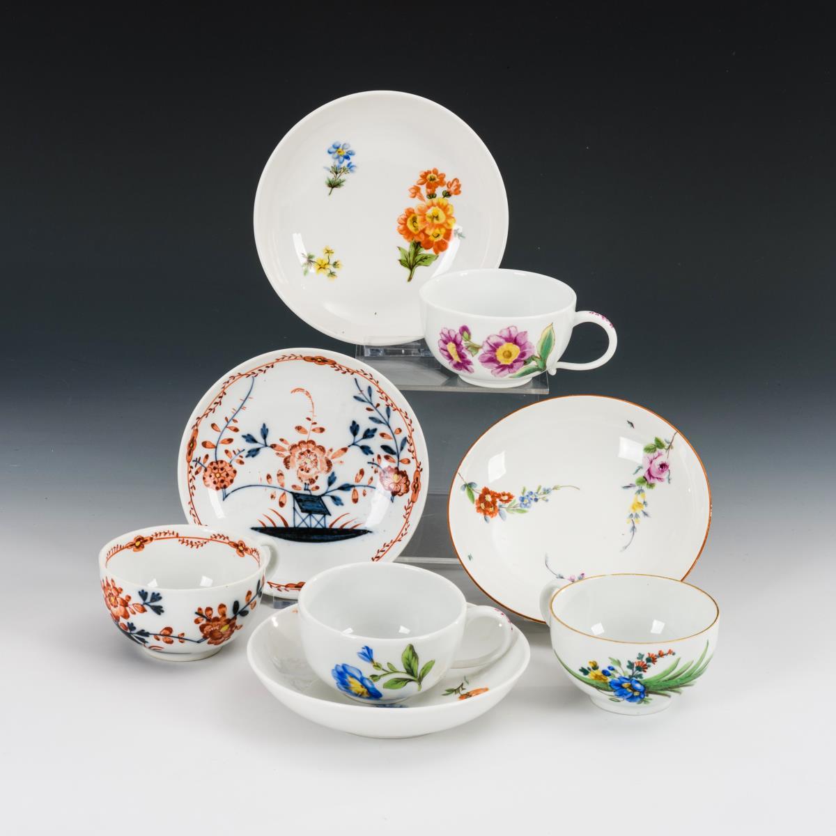Polychrom bemalt, goldstaffiert. H Tassen 4,5 - 5 cm, Ø originale Untertassen 13 - 13,5 cm.