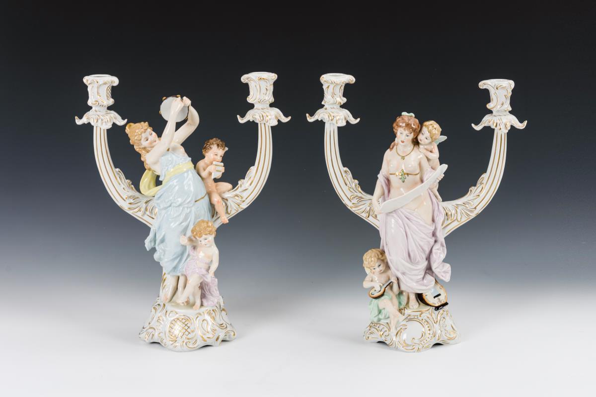 Uhr mit Rocaillegehäuse, zwei Putten und Dame mit Lyra, Quartzuhrwerk. / 2 2-flammige Leuchter mit singender Frauenfigur bzw. Frauenfigur mit Tamburin. 1 Finger und 1 Lyraabschluss bestoßen.