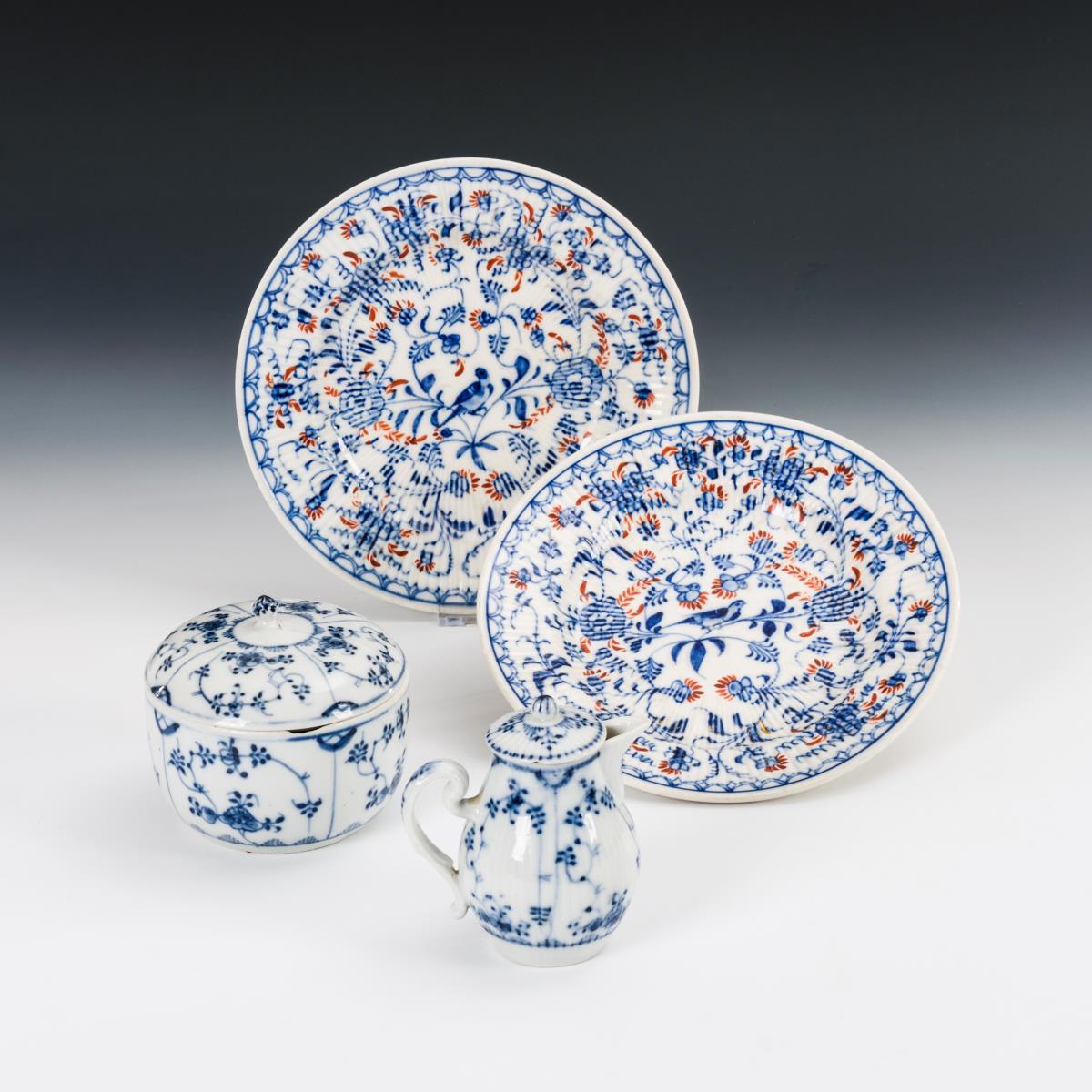 2 Vogelmuster-Teller (Ø 20 cm) sowie Kännchen (H 10 cm) und Zuckerdose (H 9 cm) mit ausgetuschter Strohblumenmalerei. Zuckerdosendeckel mit Haarriss, Randbestoßung an der Zuckerdose und am Kännchendeckel.