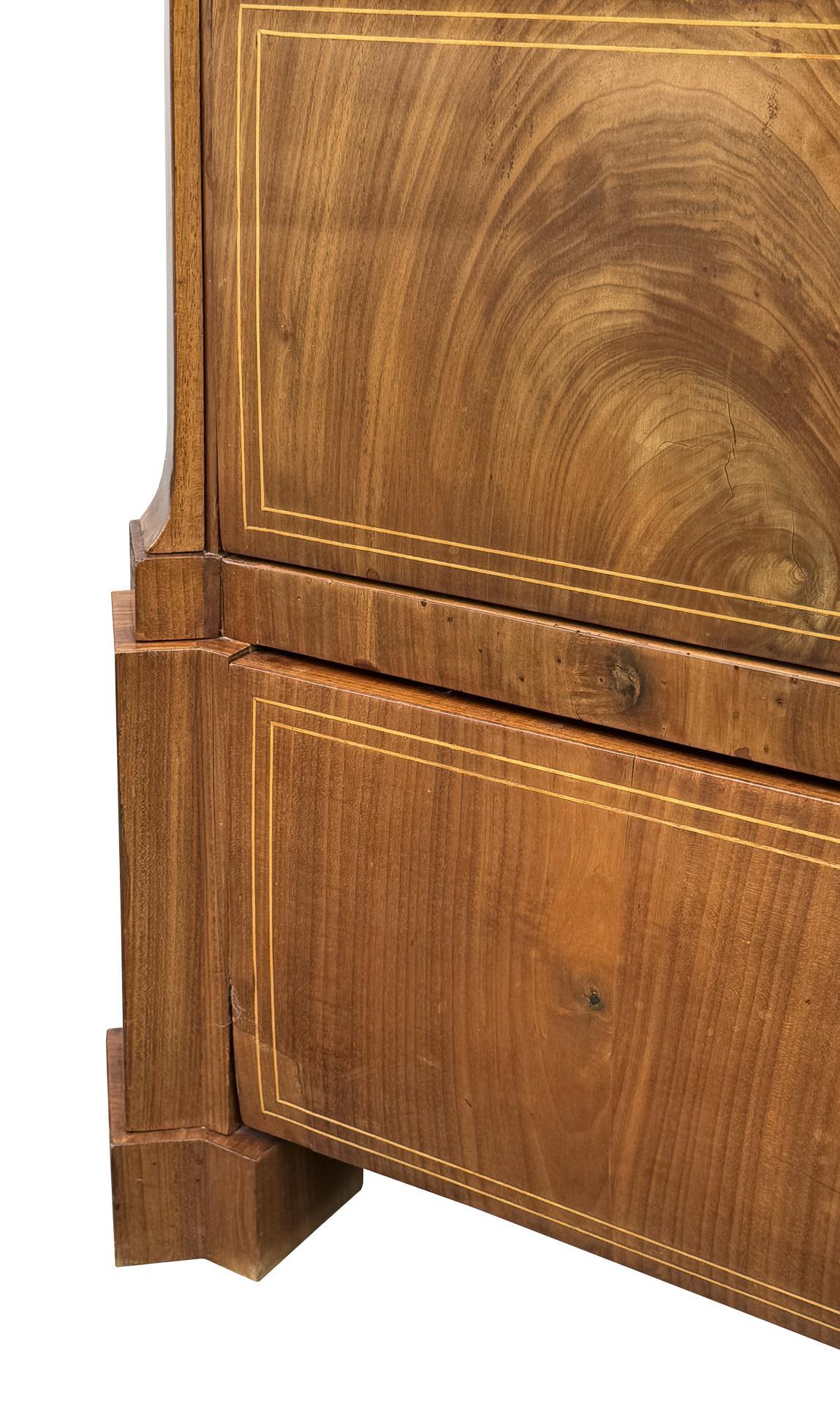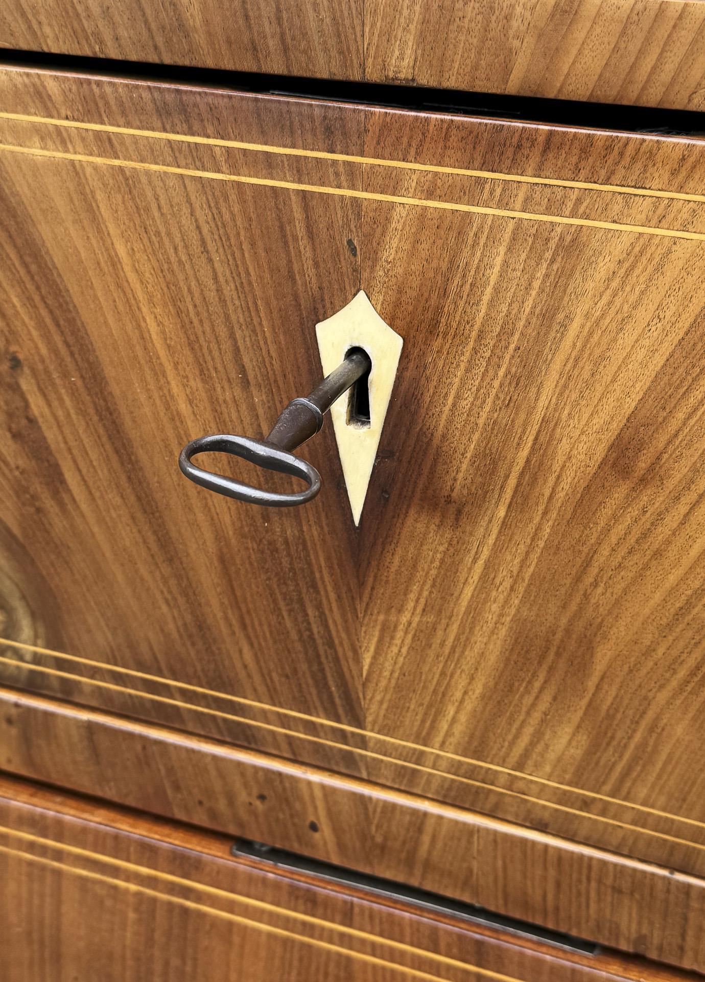 Mahagoni furniert, Ahorn-Fadenmarketerie, Schlüsselschilder aus Bein. 76 x 82 x 43 cm.