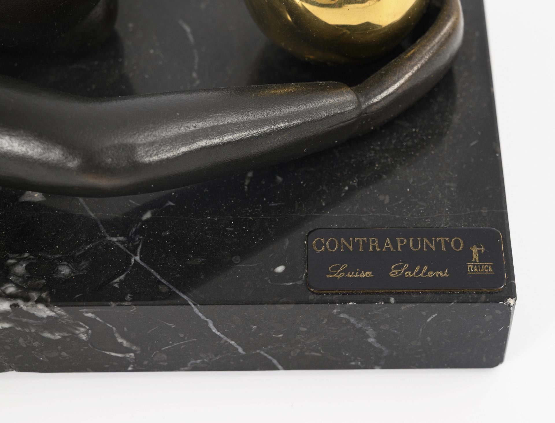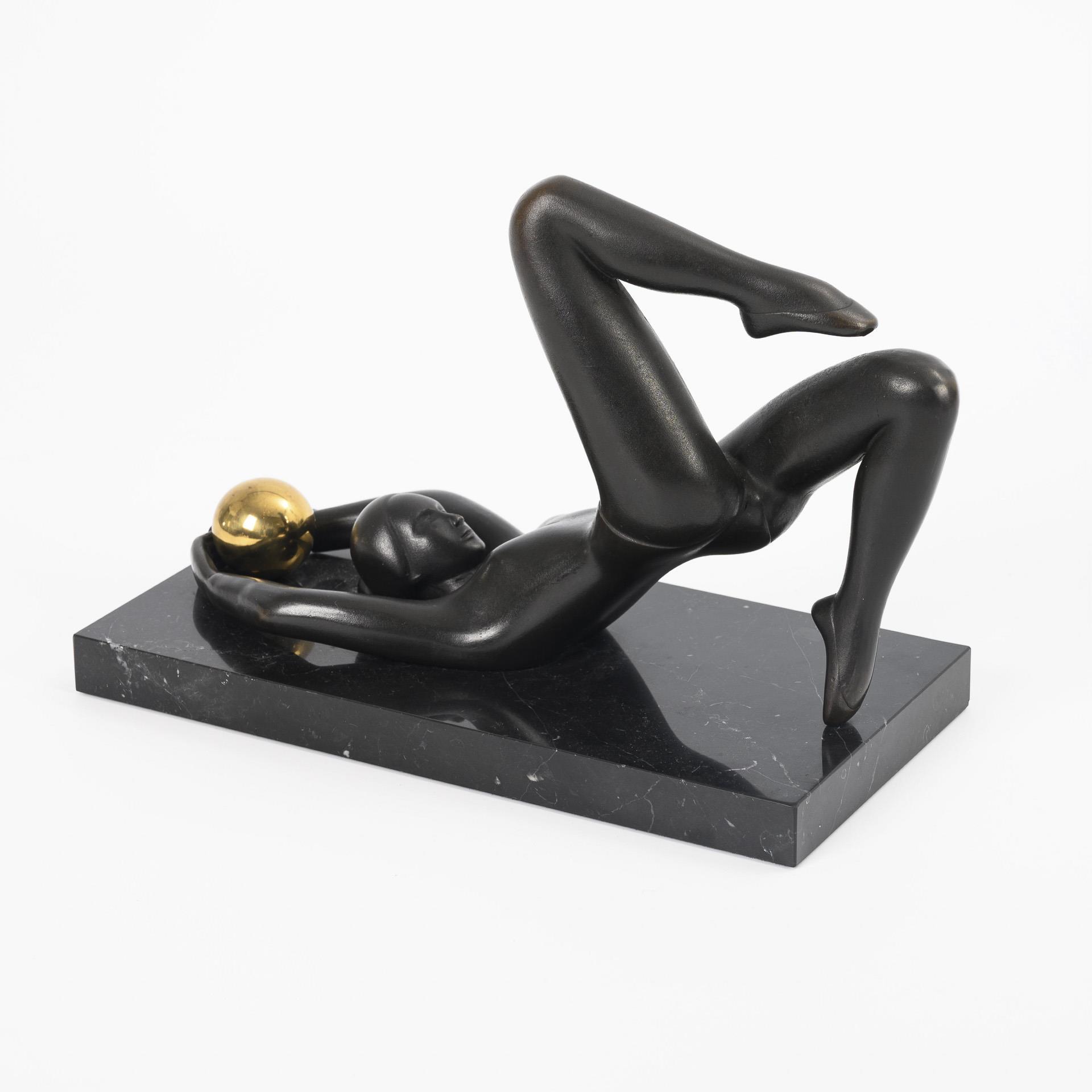 Bronze schwarz patiniert, teils goldfarben, schwarze Marmor-Plinthe. Auf dem Plinthen-Etikett bezeichnet und betitelt mit "Italica"-Marke, auf dem Filz der Standfläche "Italica, made in Spain". H 15 cm, gesamt 18 x 24 x 12 cm. 4,6 kg.