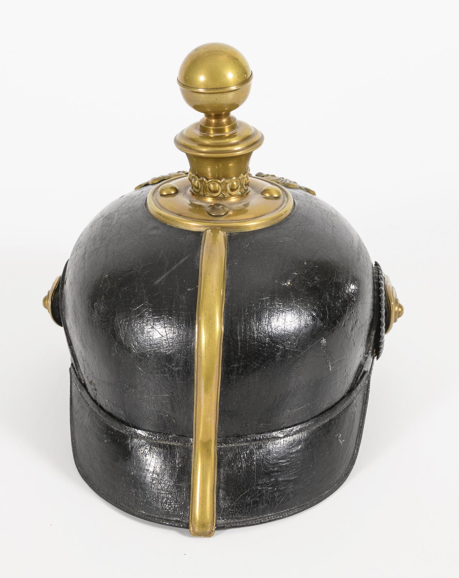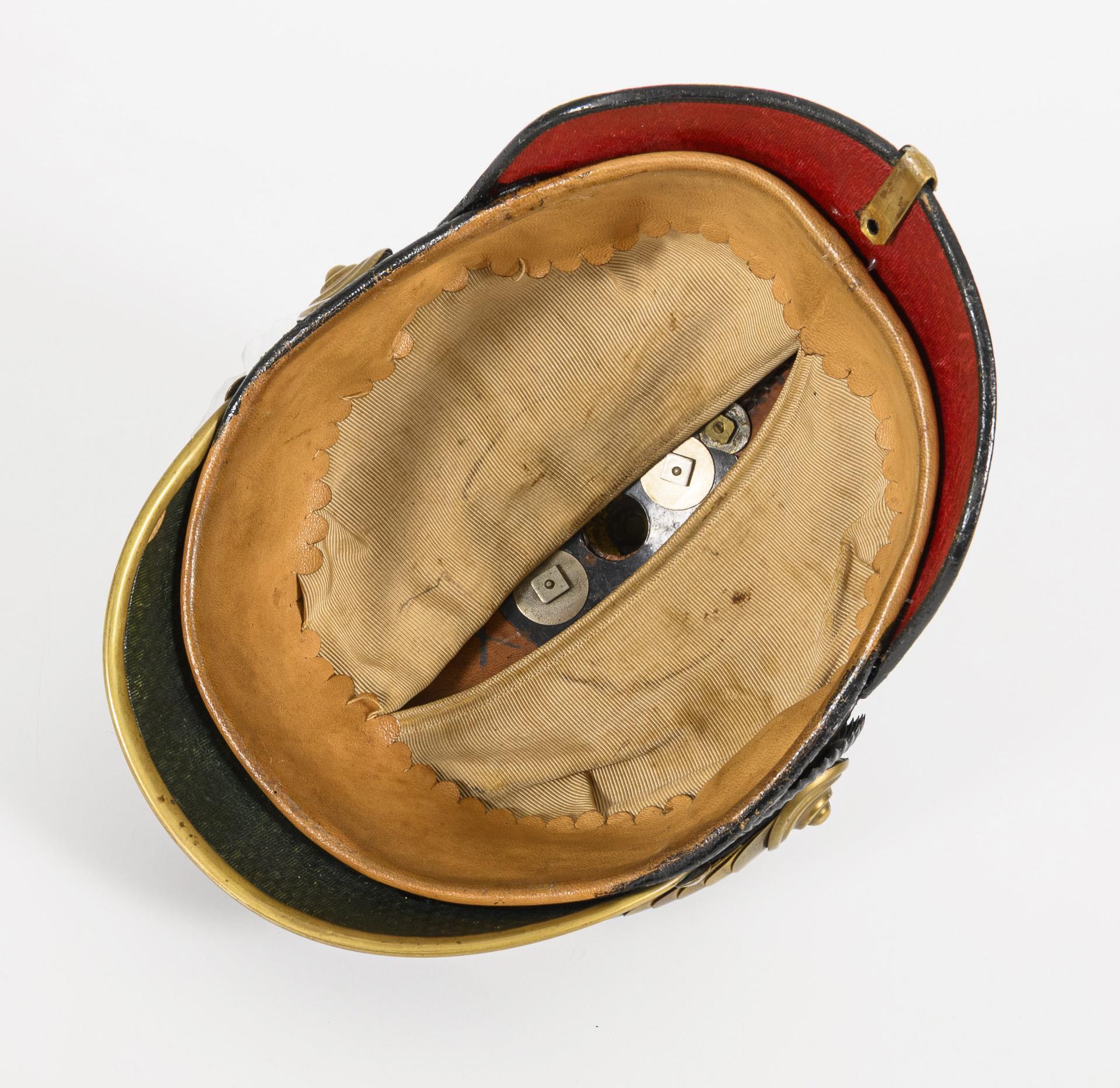 Lederhaube krakeliert, Beschläge in Ordnung, flache Schuppenkette, Reichskokarde fehlt, Kugel abschraubbar. Innen mit braunem Schweißleder und Ripsfutter. Schraube der Nackenschiene unter dem Nackenschirm fehlt.