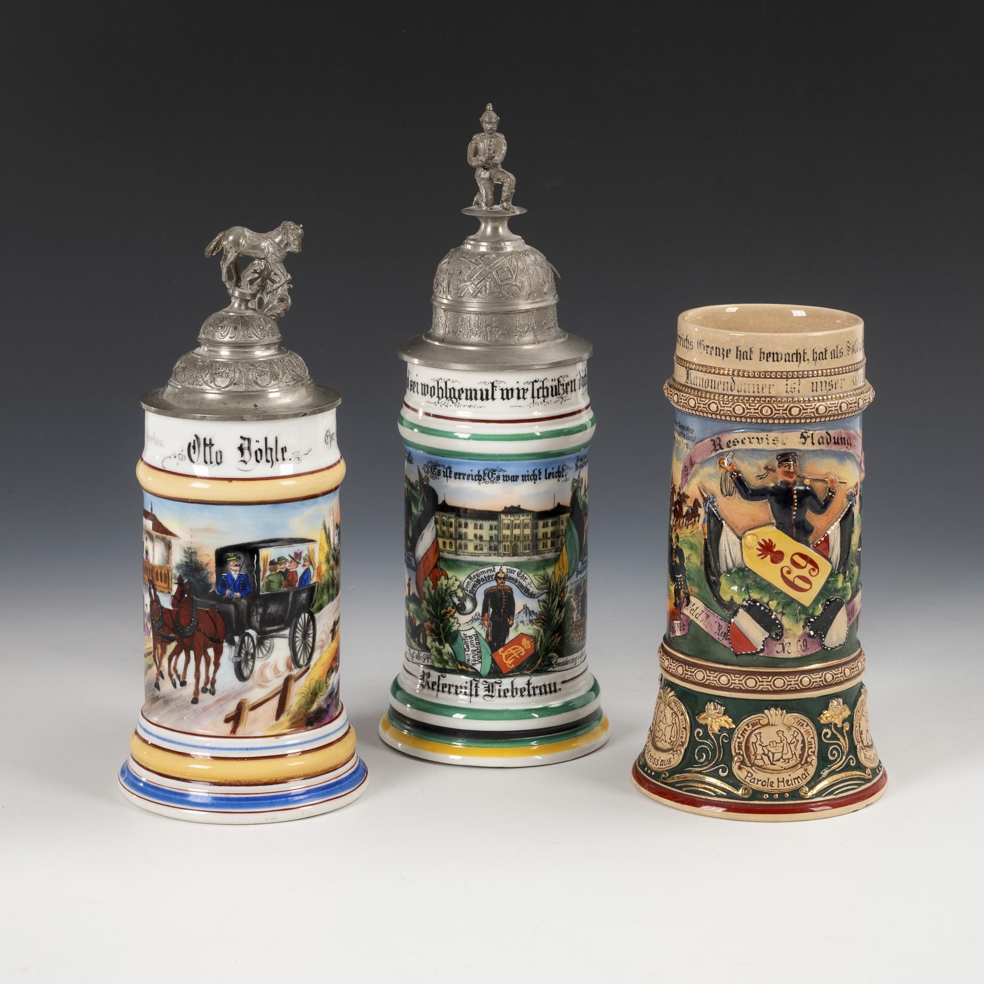 "Reservist Liebetrau, 6. Komp. 5. Thür. Inft.-Regt. Nr. 94. Grossherzog v. Sachsen. Eisenach 1910-1912". Stehender Soldat über Schulterstück, darüber Kaserne; flankiert von Militärszenen sowie geschriebene Namensliste. Relief-Zinndeckel mit kniendem Soldaten und Adlerdrücker. / Kutscherkrug "Otto Döhle" mit Zweispänner und Gesellschaft vor einem Gasthaus. Zinndeckel mit Pferdefigur und Pflanzendrücker. / Reliefierter Keramikkrug ohne Deckel mit zentralem Schulterstück und Soldat, geschriebene Namensliste. "Reservist Fladung, 1. Bttr. Feld Art. Rgt. No 69. St. Avold" (Lothringen). Angusssteg Kutscherkrug gelötet, Namensliste Keramikkrug berieben.