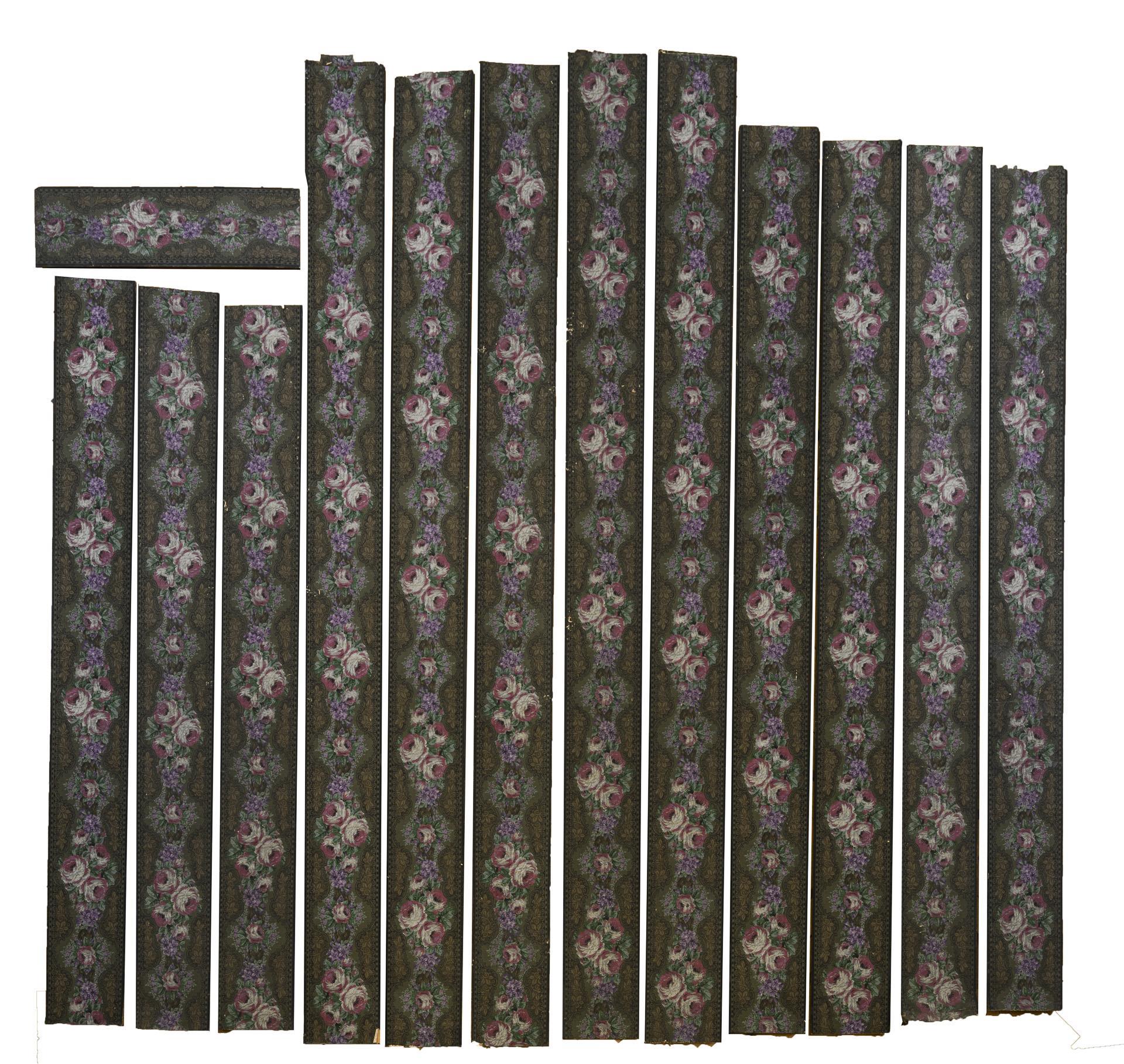 14 Tapetenstreifen mit dunkelgrünem Fond und rocaillierten Borten, dazwischen Rosenranken mit zartrosa-weißen und lavendelfarbenen Blüten. Altersspuren, partiell Defekte.
