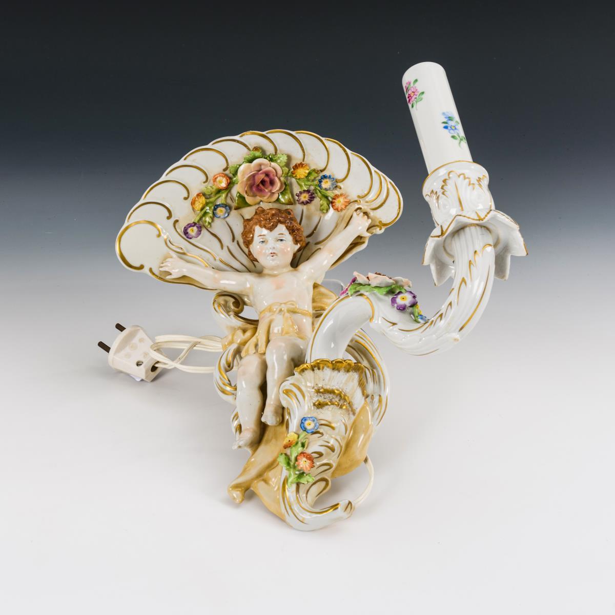 1-flammiger Leuchter mit Putto und Blütenbelag. Elektrifiziert (Funktion nicht geprüft). 1 Blüte bestoßen.