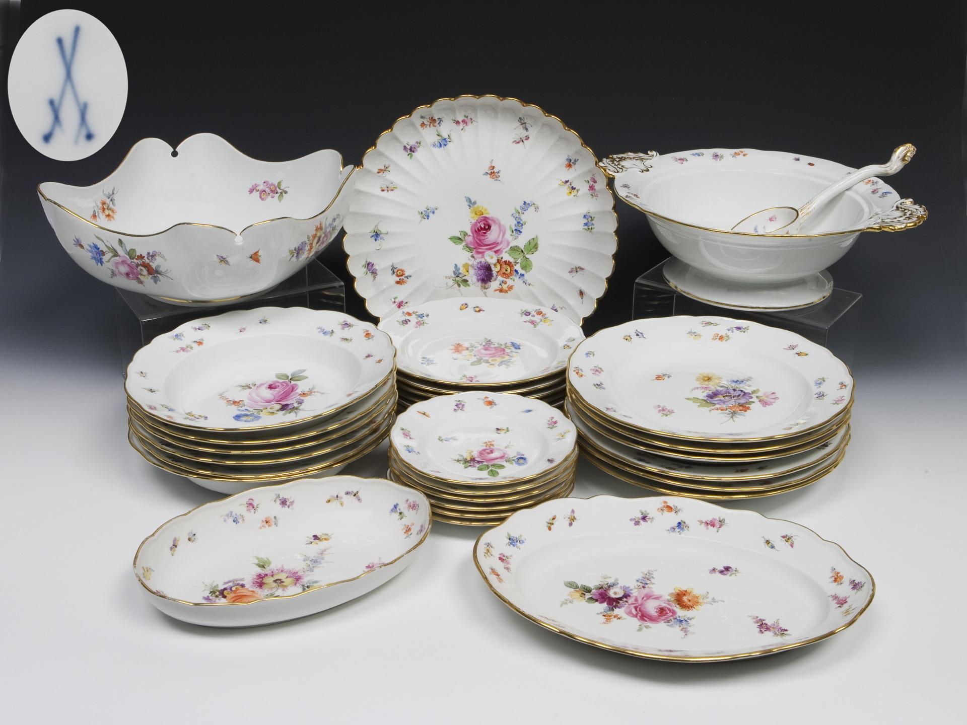 Form "Neuer Ausschnitt", farbig bemalt, gold staffiert, Dekor "Blumen und Insekten". 30 Teile: 6 Essteller, 6 Suppenteller, 6 große Dessertteller, 6 kleine Dessertteller, 1 runde Fächerschale, 1 ovale Schale, 1 ovale Platte, 1 Fußschale mit reliefierten Handhaben (ehemals mit Deckel), 1 quadratische Schüssel, 1 Schöpflöffel. Pressmarken, Schwertermarken, große Dessertteller 1981. Ein Goldrand berieben.