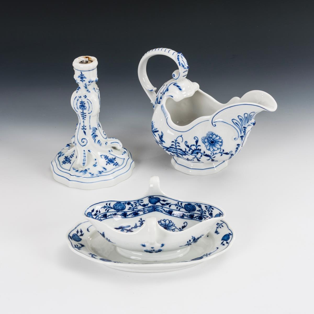Zwiebelmuster-Leuchter und 2 -Saucieren. Meissen.