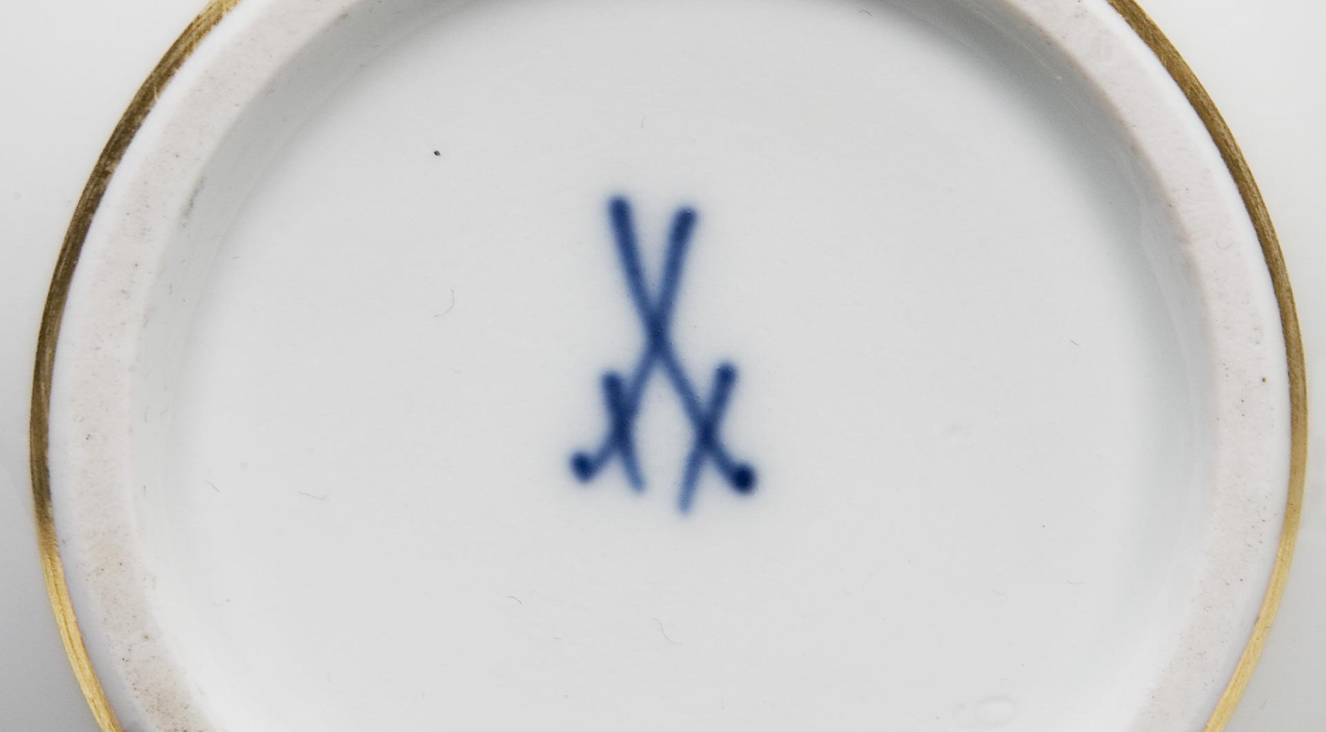 Form "Neuer Ausschnitt", farbig bemalt, gold staffiert, Dekor "Blumen und Insekten". Teedose nur mit Blumenmalerei, ohne Insekten, 1935-1947. Pressmarken, Schwertermarken. Rose minimal bestoßen.