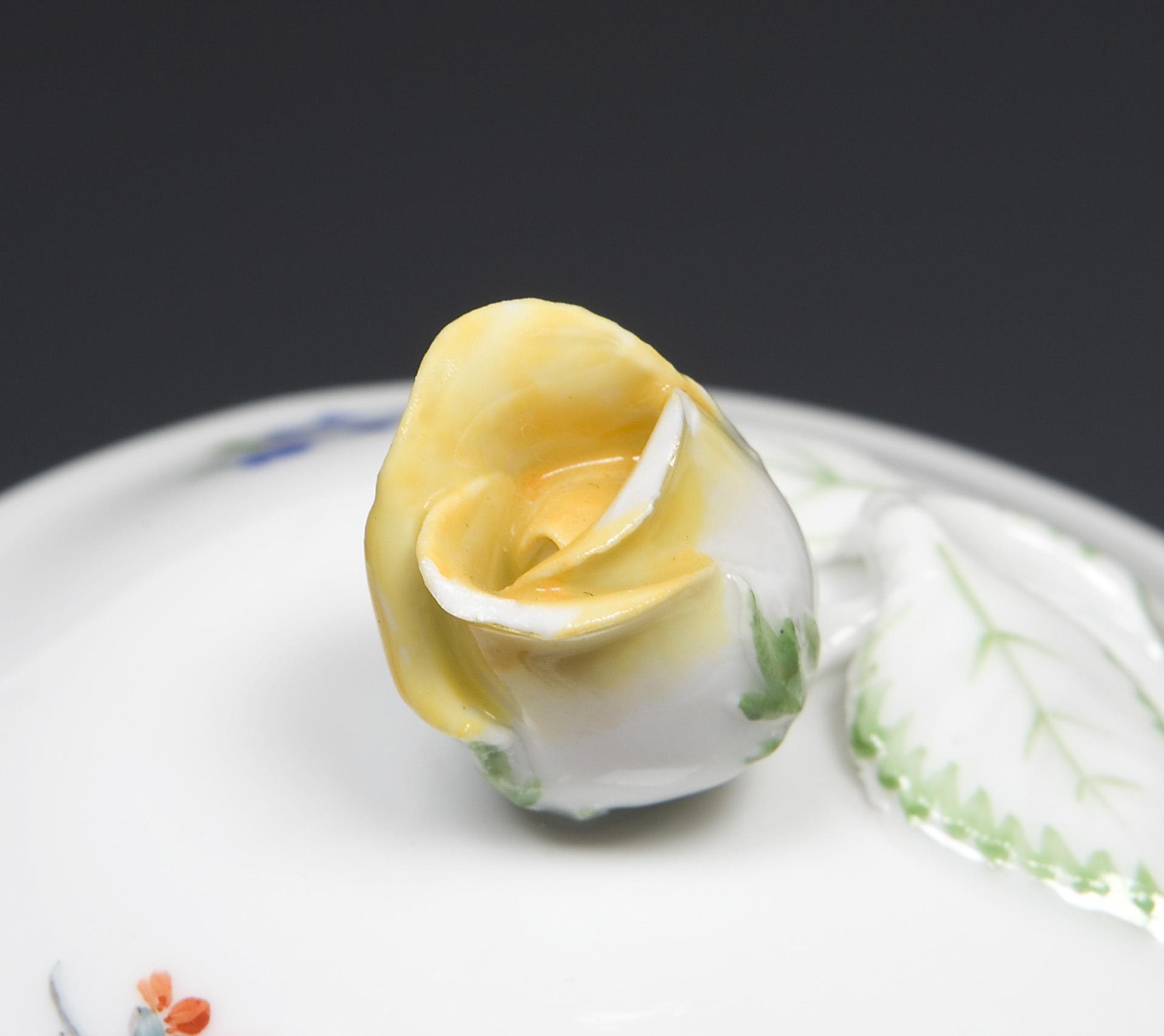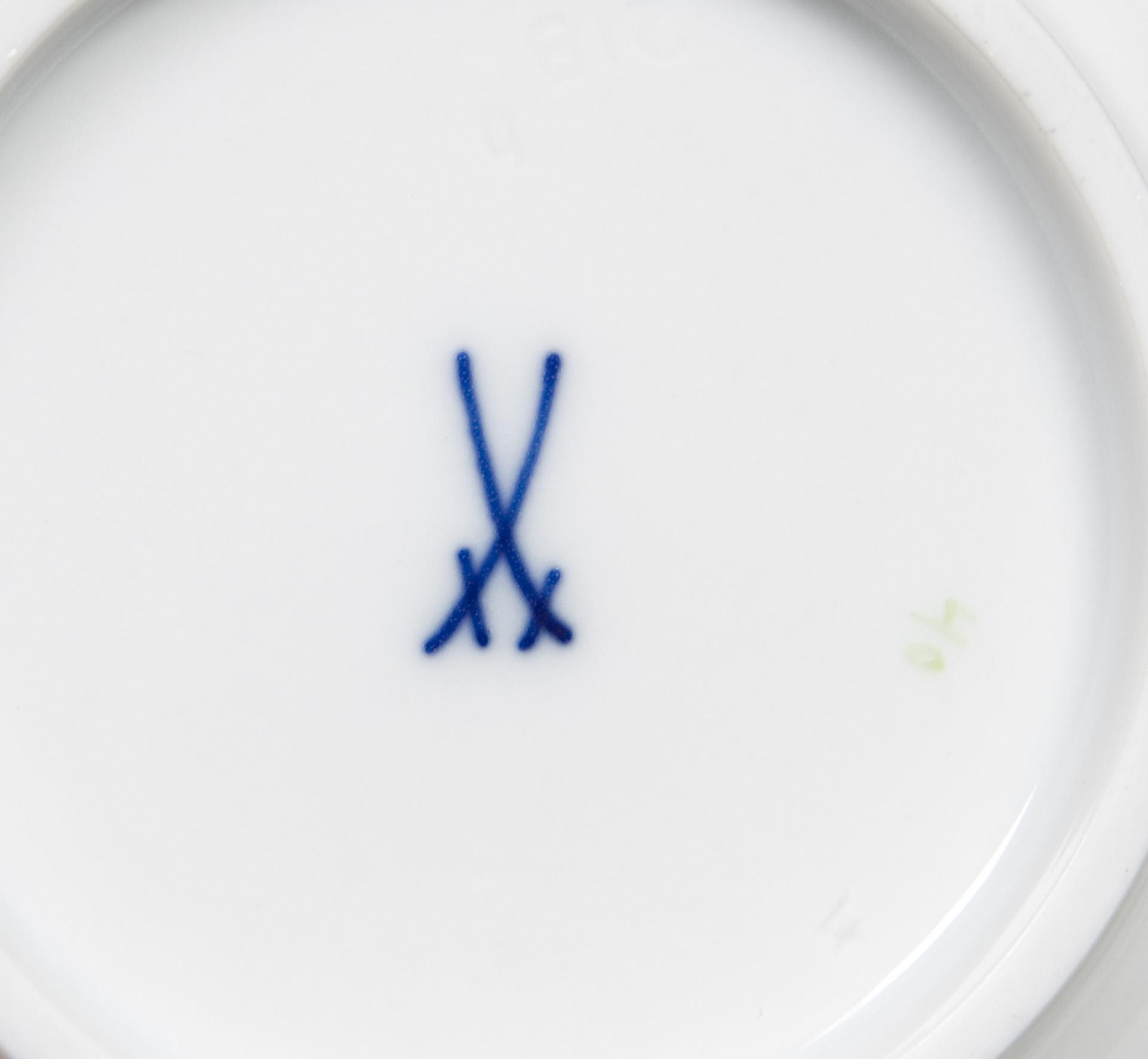 Form "Neuer Ausschnitt", farbige Blumenmalerei, gold staffiert. 22 Teile: Kaffekanne, Zuckerdose, Milchkännchen, kleine Gebäckschale, 6 Tassen, 6 Untertassen, 6 Dessertteller. Pressmarken, Schwertermarken, vier Schwertermarken zweimal gestrichen. Rosen leicht bestoßen.