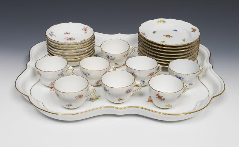Form "Neuer Ausschnitt", farbig bemalt, gold staffiert, "Streublumen-Dekor". 25 Teile: 8 Mokkatassen, 8 Untertassen, 8 kleine Dessertteller, 1 großes Tablett. Pressmarken, Malermarken, Schwertermarken, drei Teller zweimal gestrichen, Teller, Tablett 1978-1992.