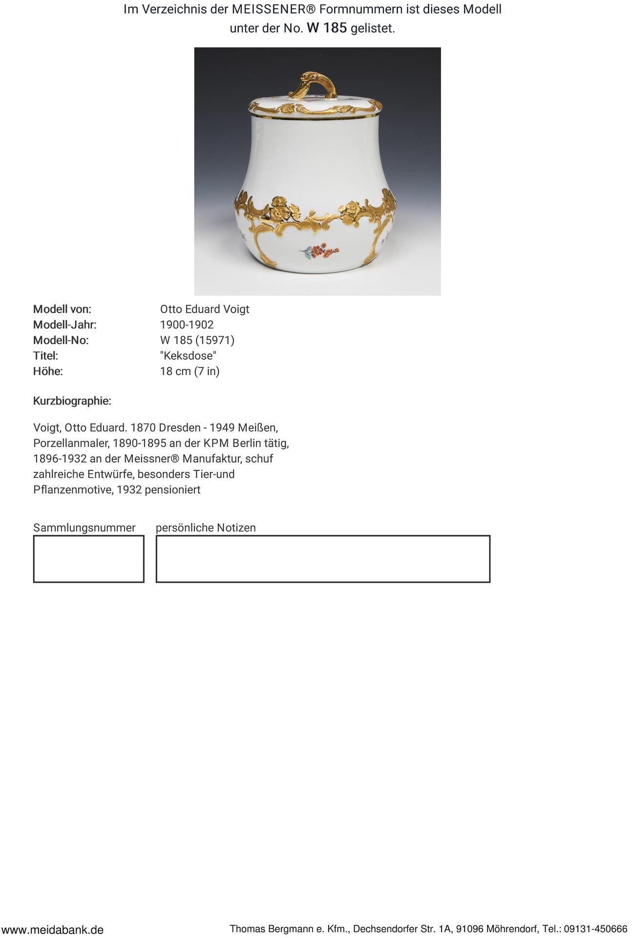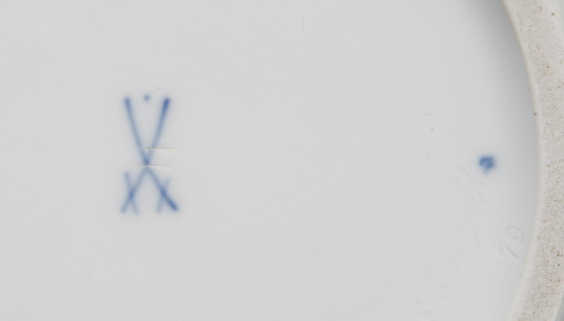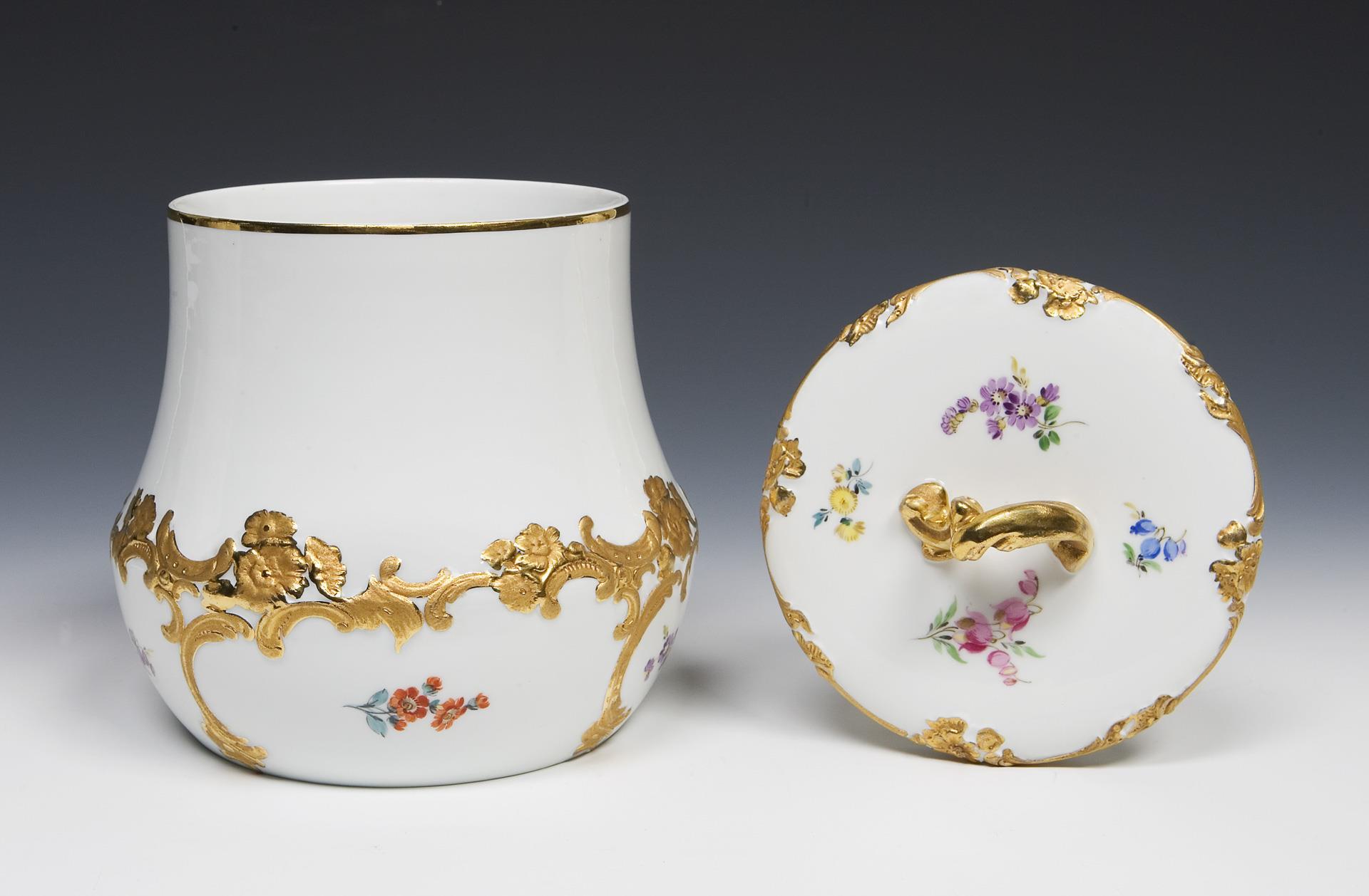 Modell-Jahr: 1900-1902. Vergoldetes Reliefdekor mit Blüten und Rocaillen, farbig bemalt, "Streublumen-Dekor", Goldstaffage. Ritzmarke, Pressmarke, Malermarke, Schwertermarke mit Punkt zweimal gestrichen.