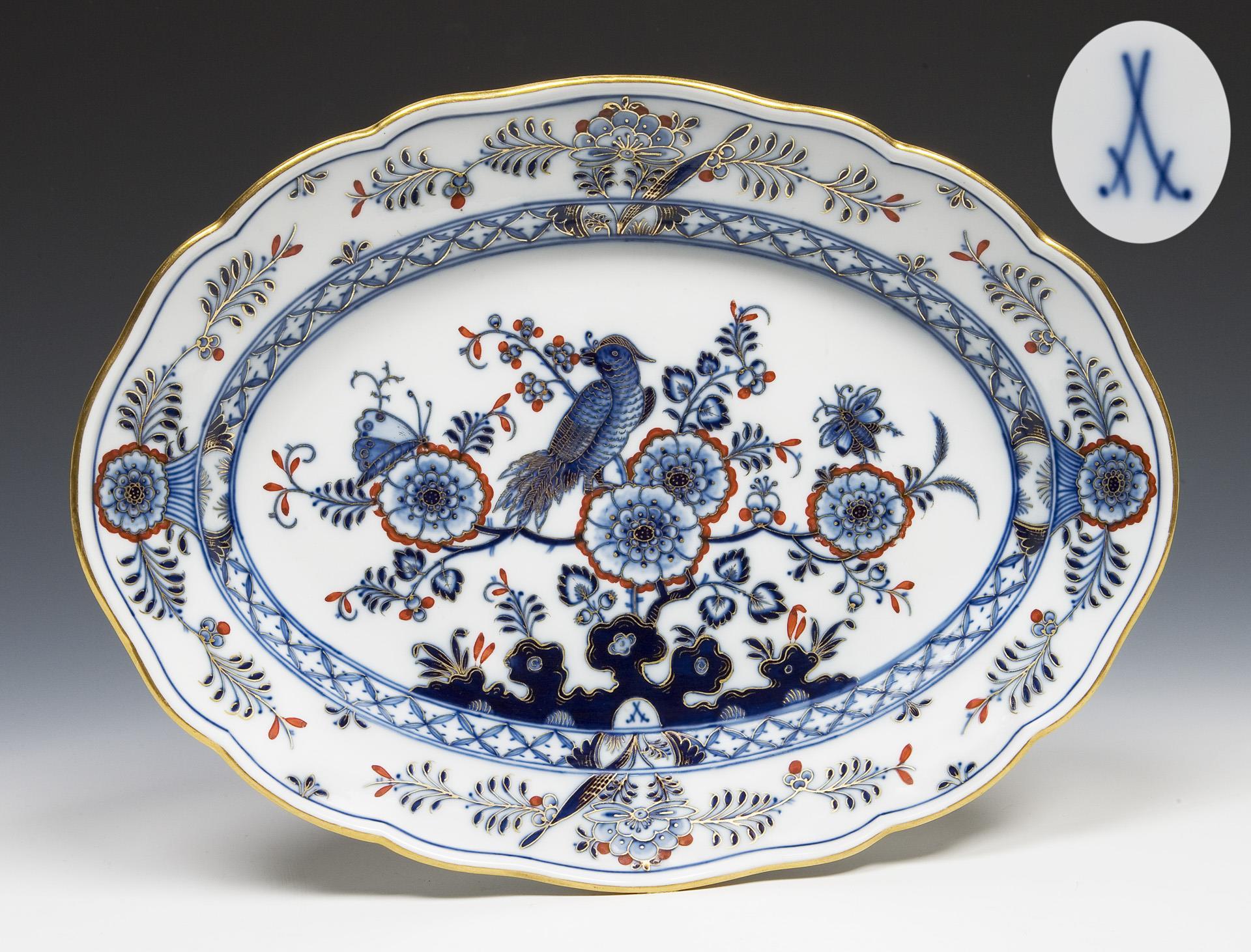 Form "Neuer Ausschnitt", kobaltblaue Unterglasurmalerei, korallenrot und gold schattiert, gold staffiert. Flächendeckend bemalt mit Vogel und Blütenzweig über Felsen, Ornamentbordüre. Pressmarke, Malermarke, Schwertermarke.