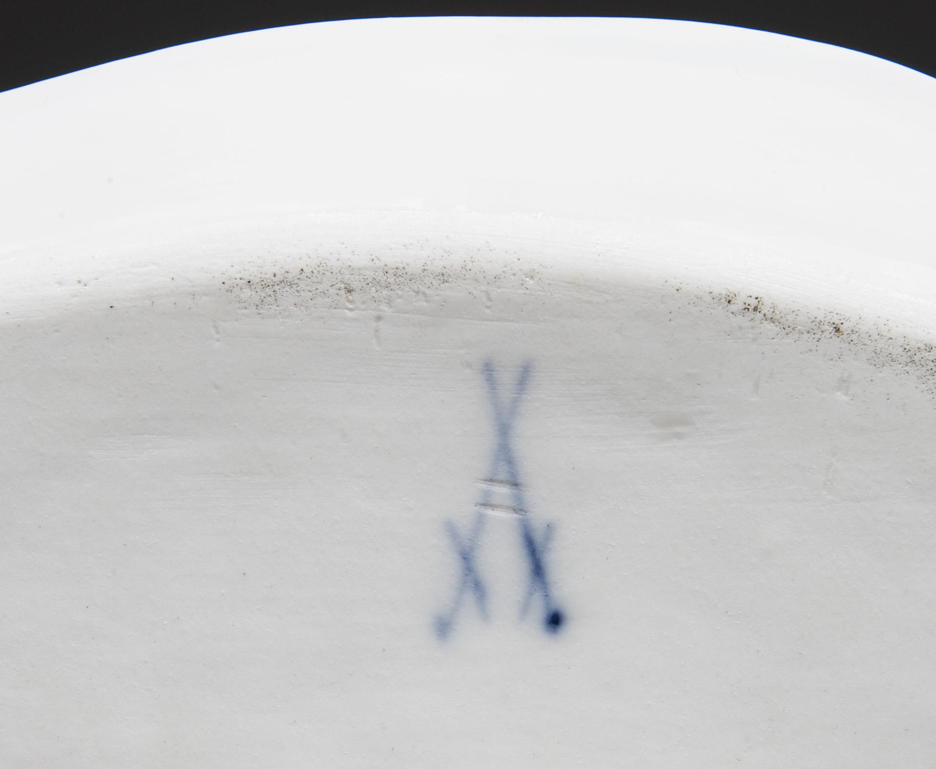 Modell von Ernst August Leuteritz und Mitarbeiter, Modell-Jahr: 1860-1863, kobaltblaue Unterglasurmalerei, "Zwiebelmusterdekor". Geschweifte Rechteckform mit ornamental reliefierter Fahne. Unglasierter Boden, Ritzmarke, Schwertermarke zweimal gestrichen. Flächiger Glasurschaden in einer Spiegelecke.
