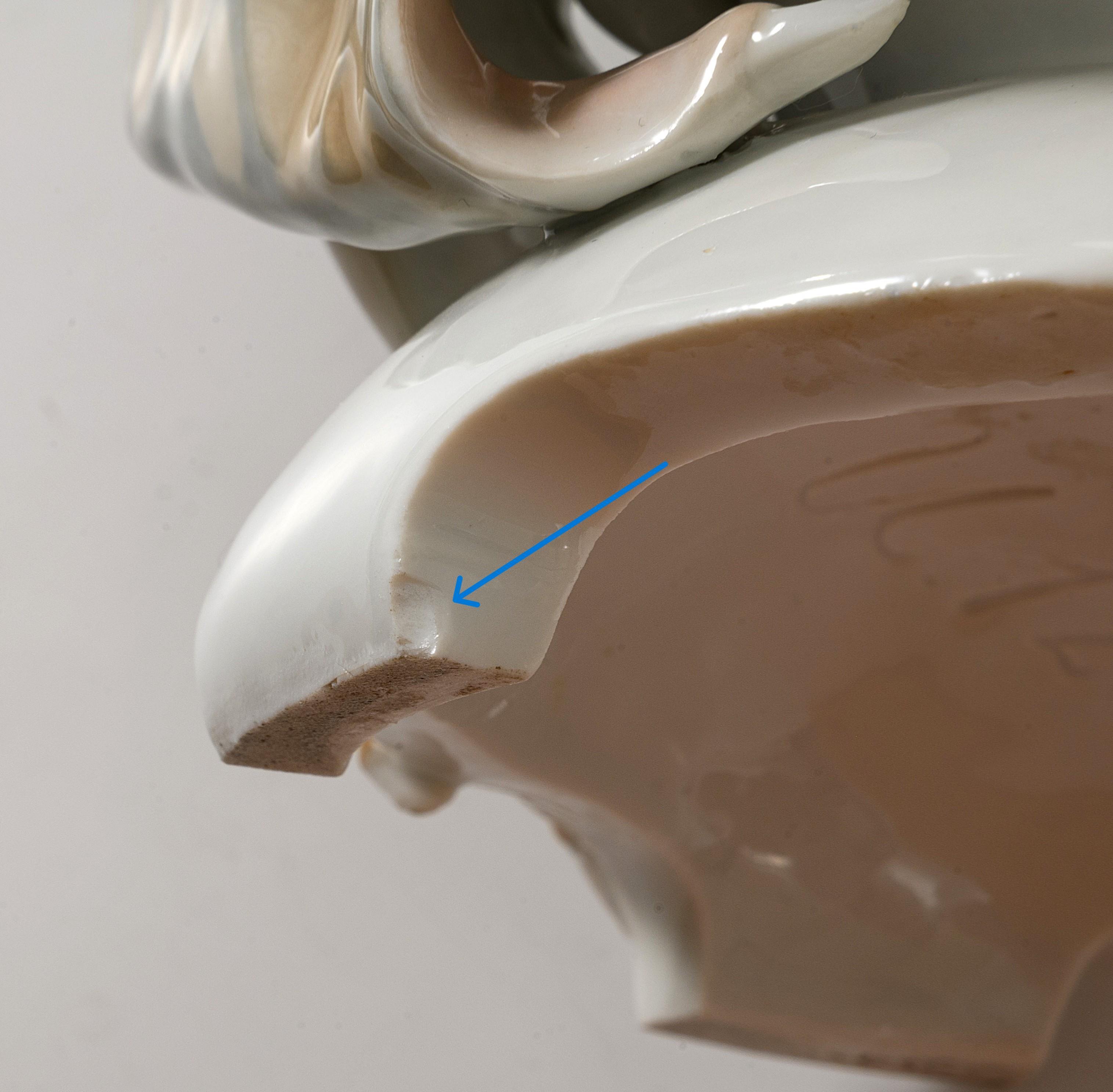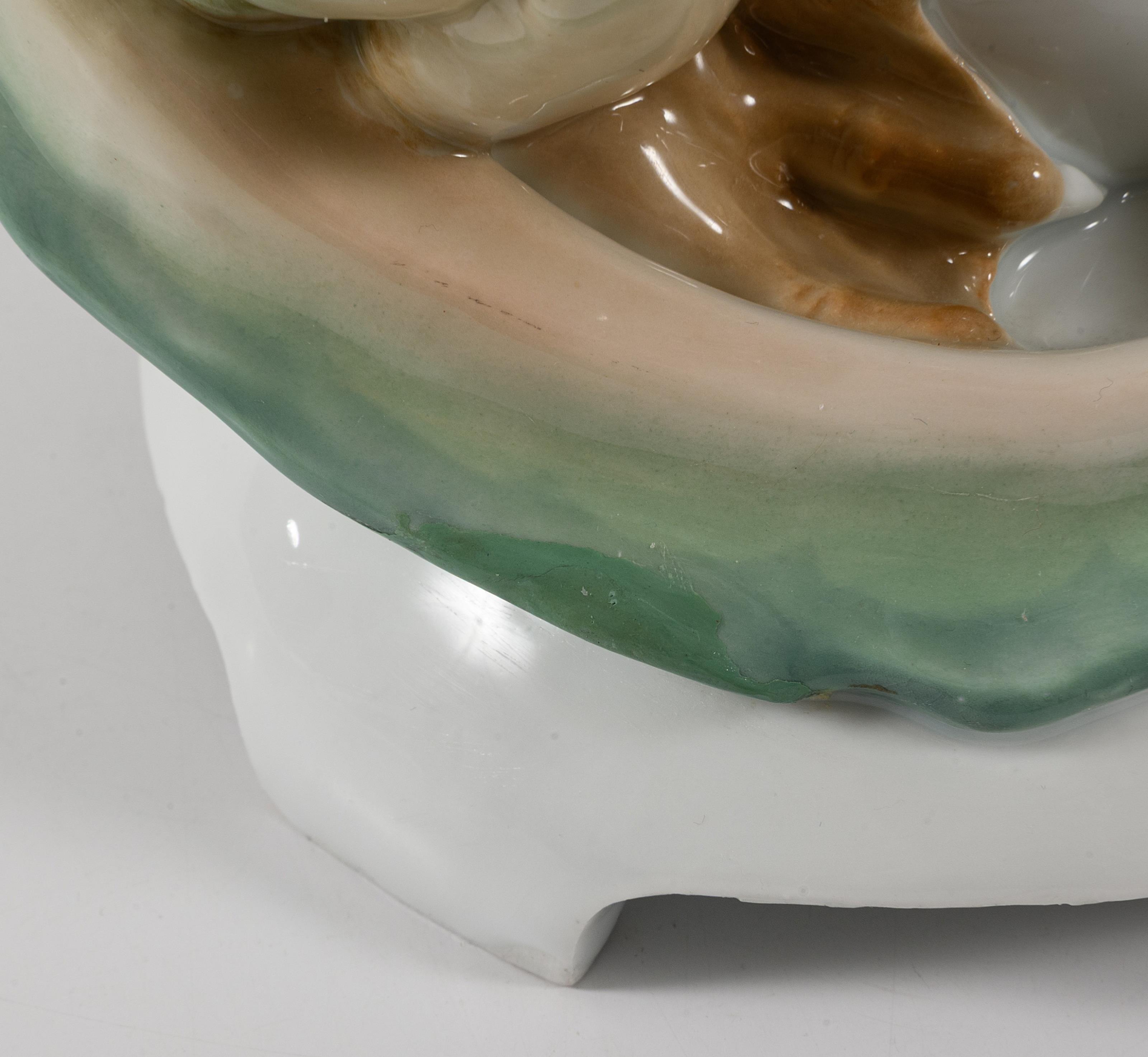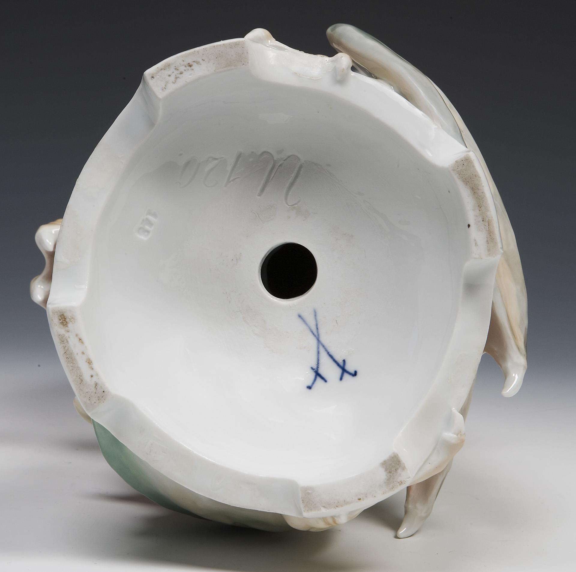 Modell-Jahr: 1904, pastellfarben bemalt, Ritzmarke, Pressmarke, Schwertermarke. Eine Kralle restauriert, zwei dunkle Glasurpünktchen.