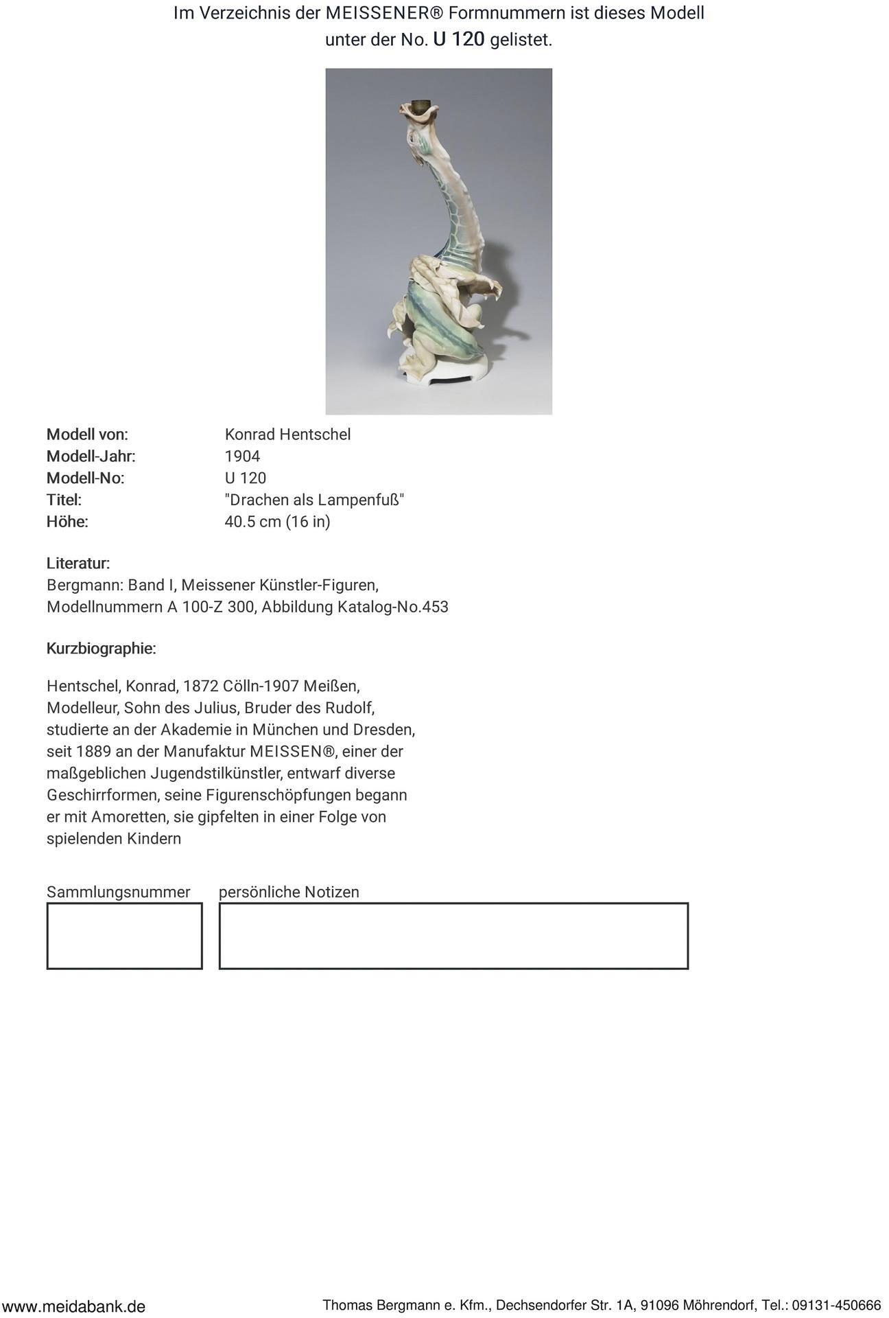Hentschel, Modelleur, studierte an der Akademie in München. Seit 1889 an der Manufaktur, entwarf diverse Geschirrformen und Figuren. Einer der maßgeblichen Jugendstil-Künstler * Partnerauktion Bergmann |Update 19.06.25: 1 Fußkante minimal bestoßen, 1 Restaurierung am Drachenschwanz.