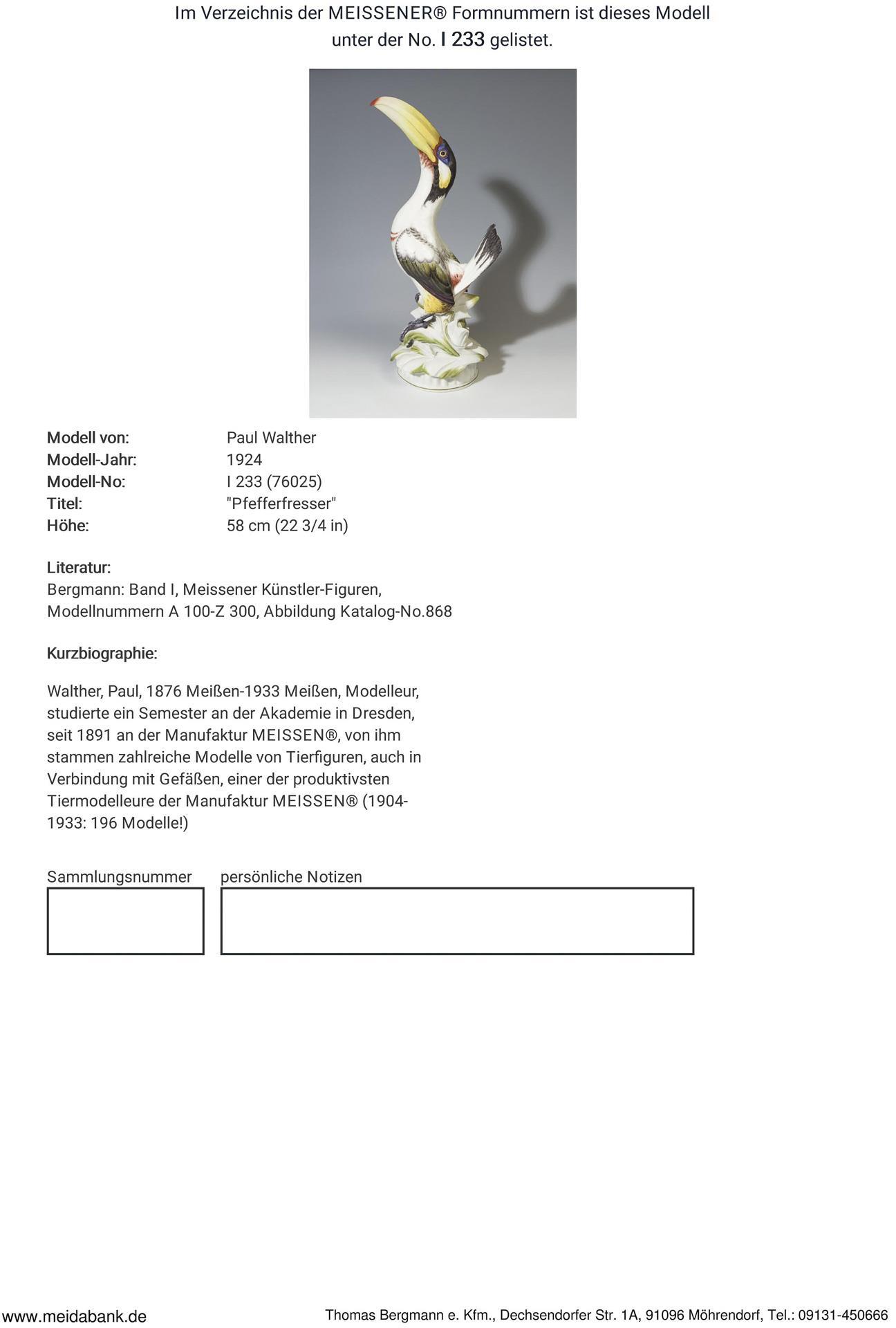 Walther, Modelleur, seit 1891 an der Manufaktur. Von ihm stammen zahlreiche Modelle von Tierfiguren, auch in Verbindung mit Gefäßen, einer der produktivsten Tiermodelleure. Meissen-Manufaktur-Preis: 15.000,- Euro * Partnerauktion Bergmann