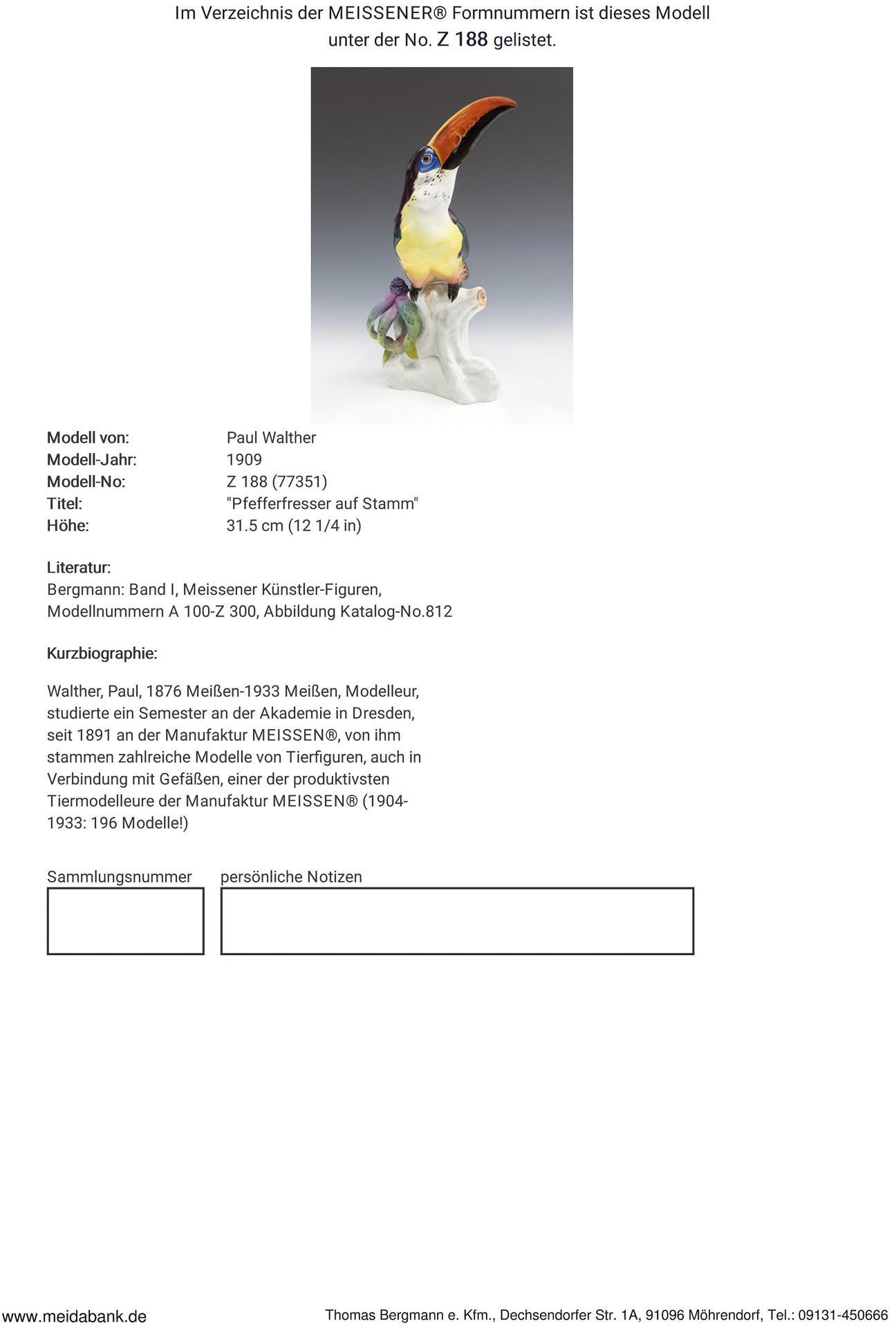 Walther, Modelleur, seit 1891 an der Manufaktur. Von ihm stammen zahlreiche Modelle von Tierfiguren, auch in Verbindung mit Gefäßen, einer der produktivsten Tiermodelleure. Meissen-Manufaktur-Preis: 4.690,- Euro * Partnerauktion Bergmann.