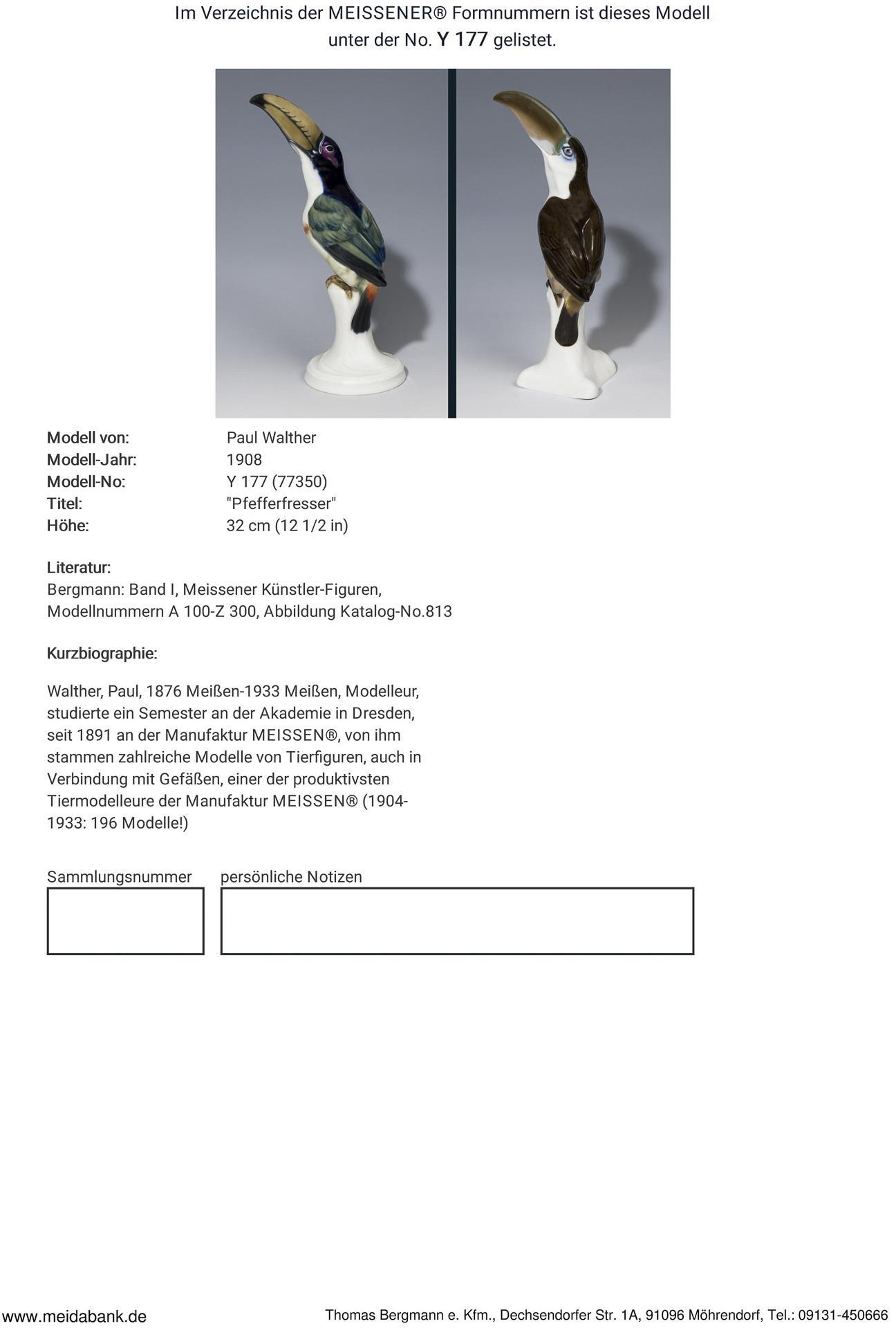 Walther, Modelleur, seit 1891 an der Manufaktur. Von ihm stammen zahlreiche Modelle von Tierfiguren, auch in Verbindung mit Gefäßen, einer der produktivsten Tiermodelleure * Partnerauktion Bergmann.