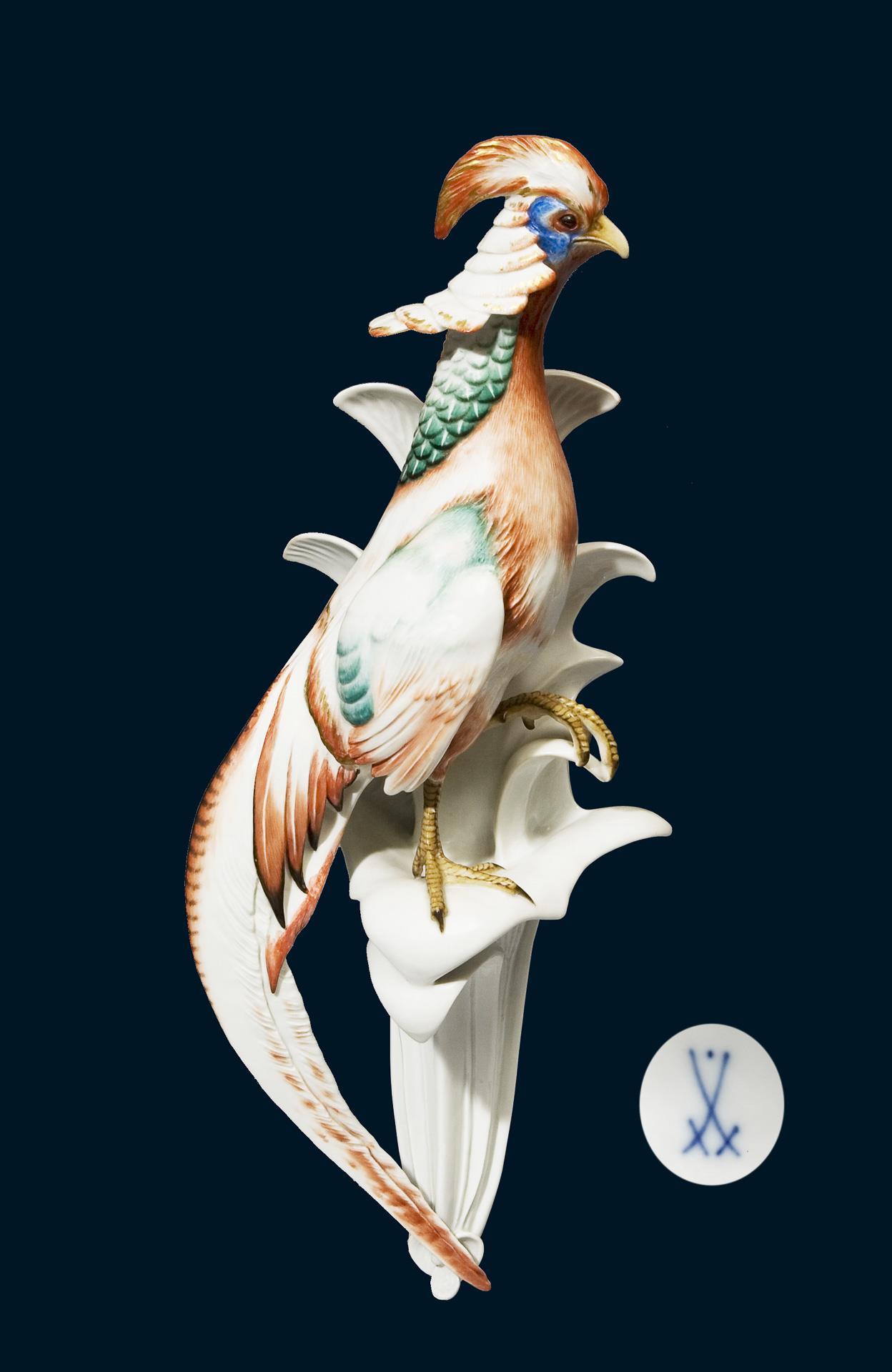 Modell-Jahr: 1929, Pendant zu Modell-Nr. L 248 "Wandplastik-Buntfasan", naturalistisch bemalt, gold staffiert. Rückseitig montierte Metall-Öse zum Aufhängen. Ritzmarke, Pressmarke, Schwertermarke mit Punkt. Untere Hälfte fachmännisch restauriert, Sockel minimal bestoßen.