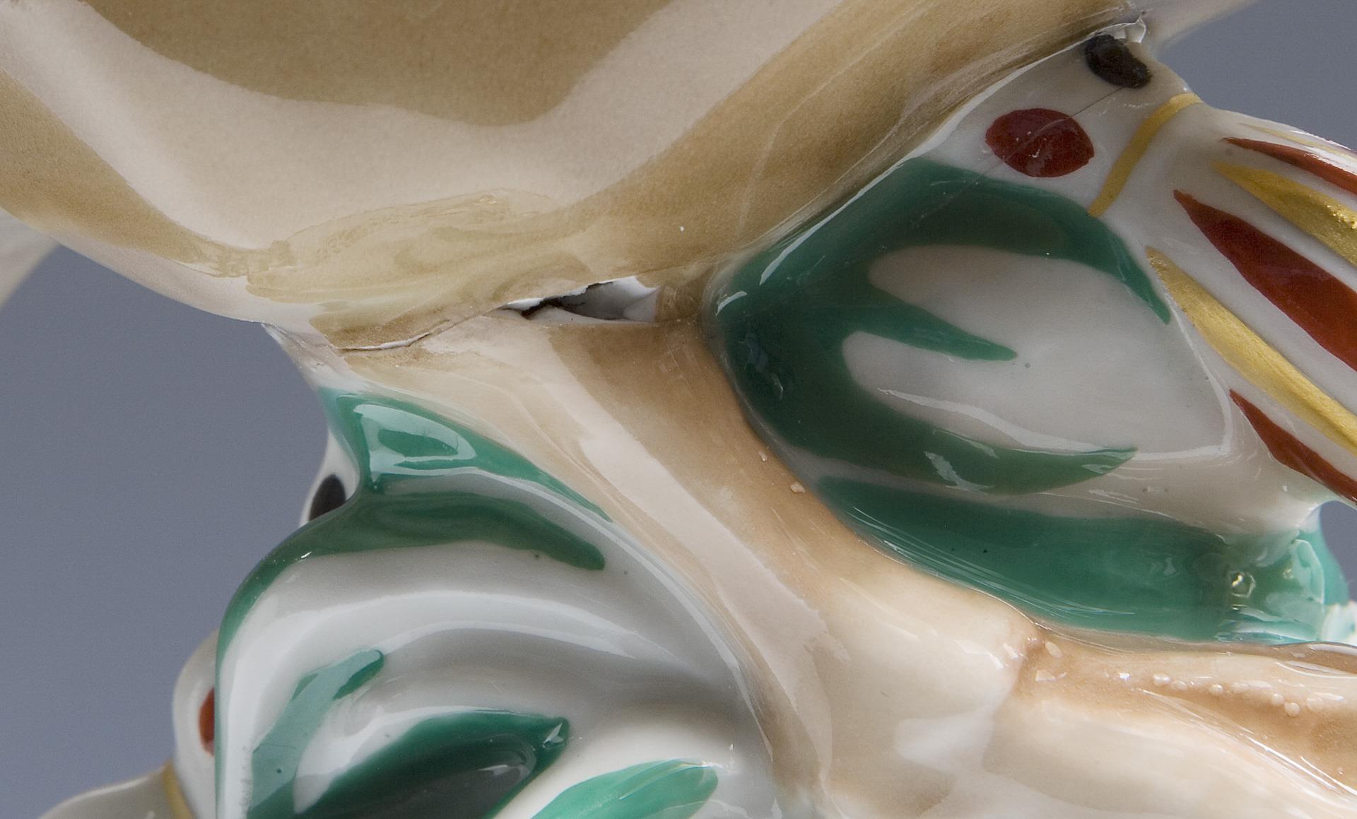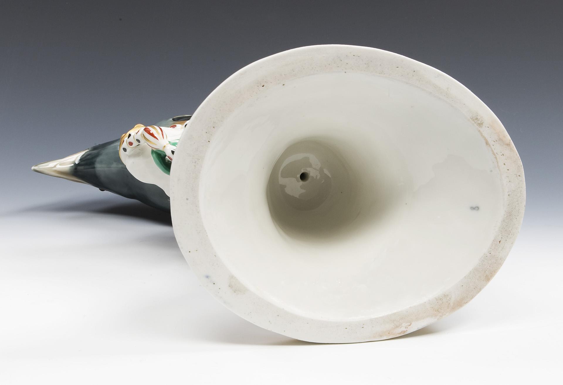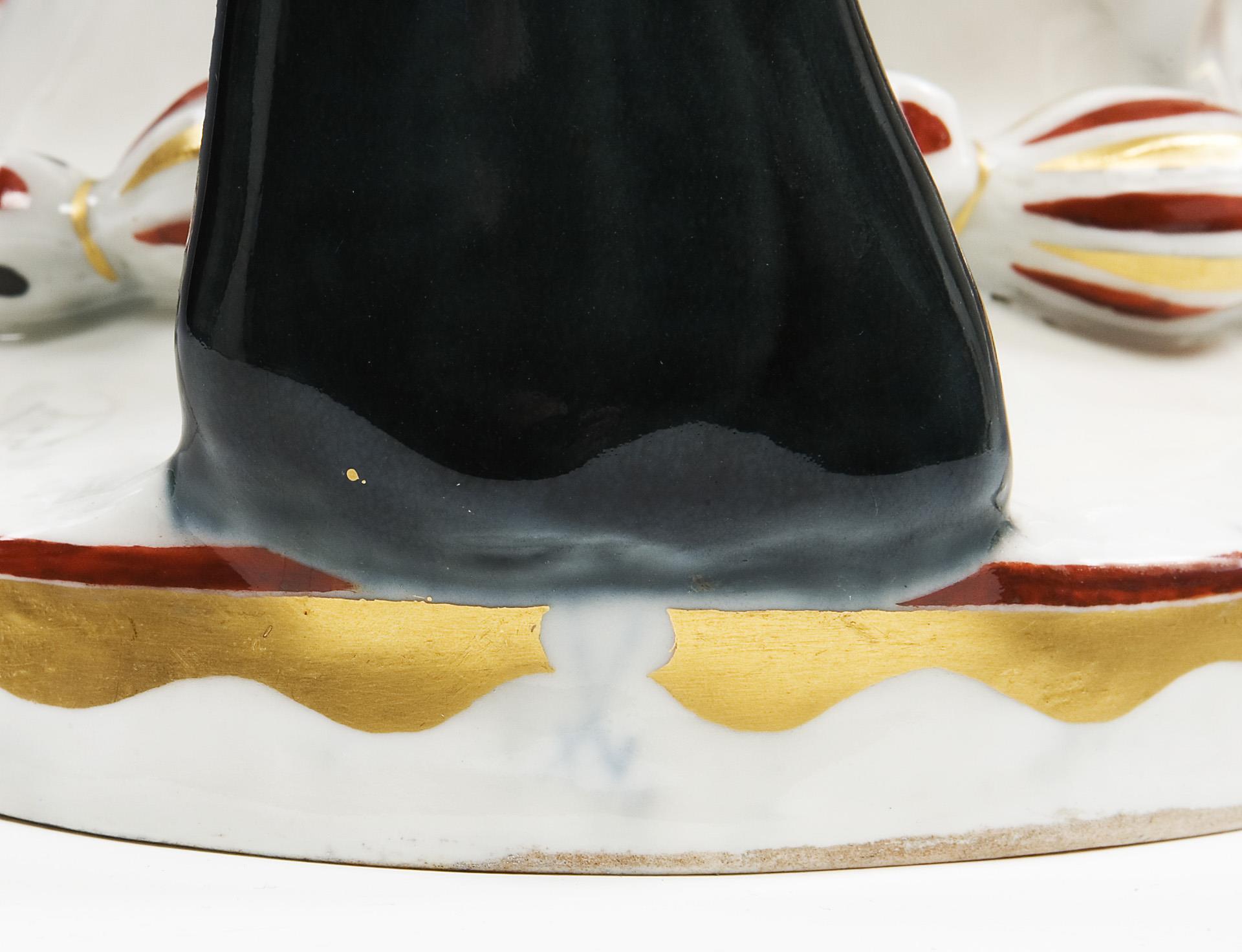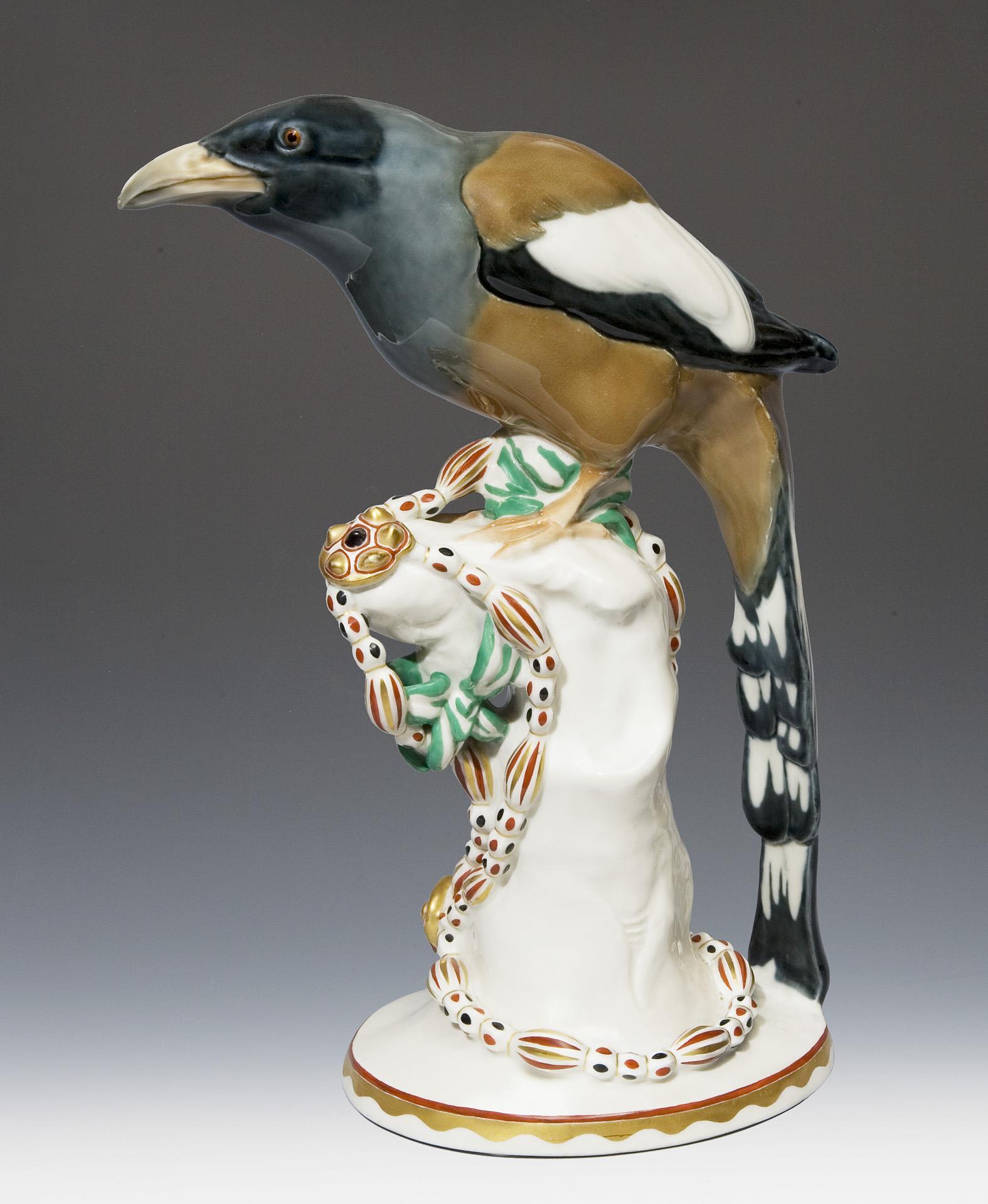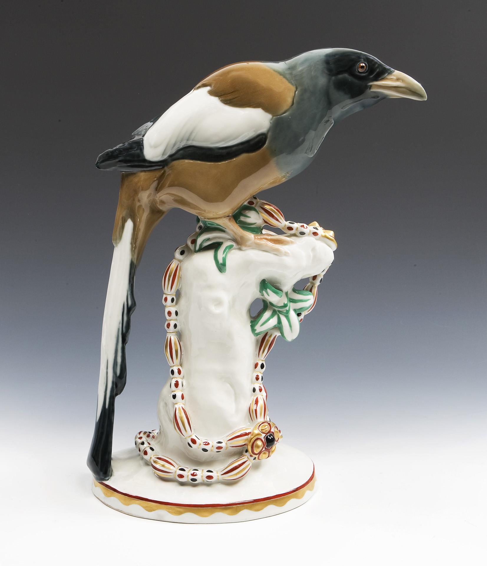 Modell-Jahr: 1912, naturalistisch bemalt, gold staffiert. Ritzmarke, Pressmarke, Malermarke, Schwertermarke am Sockel, Künstler-Signet. Partiell von der Manufaktur vor der Staffage sichtbar nachgebesserte Brandrisse, Schnabelspitze minimal, ein Beinansatz mit Haarriss bestoßen.