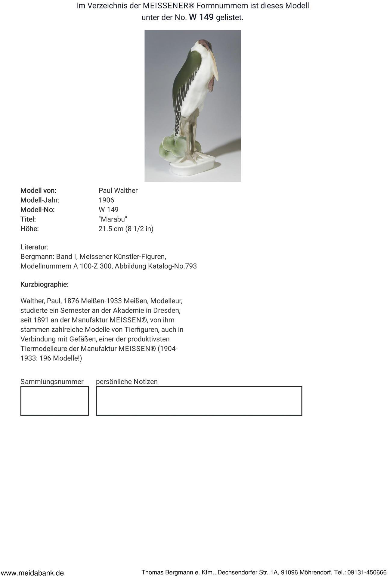 Walther, Modelleur, seit 1891 an der Manufaktur. Von ihm stammen zahlreiche Modelle von Tierfiguren, auch in Verbindung mit Gefäßen, einer der produktivsten Tiermodelleure * Partnerauktion Bergmann.