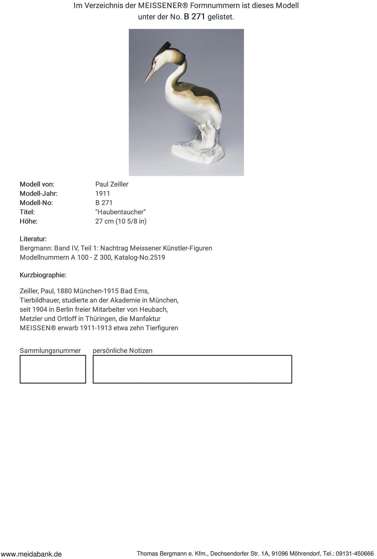 Zeiller, Tierbildhauer, studierte an der Akademie in München. Seit 1904 in Berlin freischaffend tätig. Die Meissener Manufaktur erwarb 1911-1912 mehrere Tierfiguren * Partnerauktion Bergmann.
