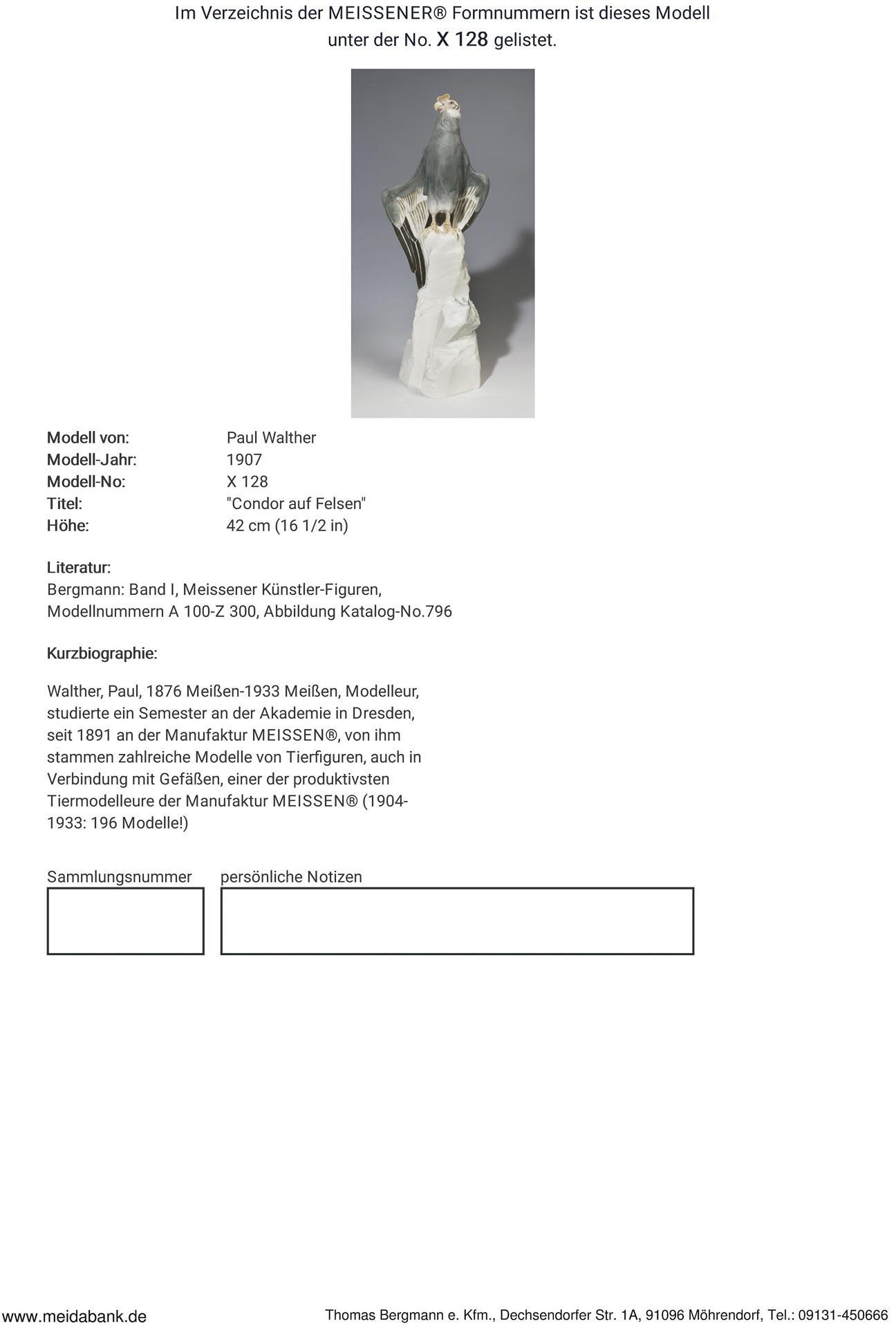 Walther, Modelleur, seit 1891 an der Manufaktur. Von ihm stammen zahlreiche Modelle von Tierfiguren, auch in Verbindung mit Gefäßen, einer der produktivsten Tiermodelleure * Partnerauktion Bergmann.
