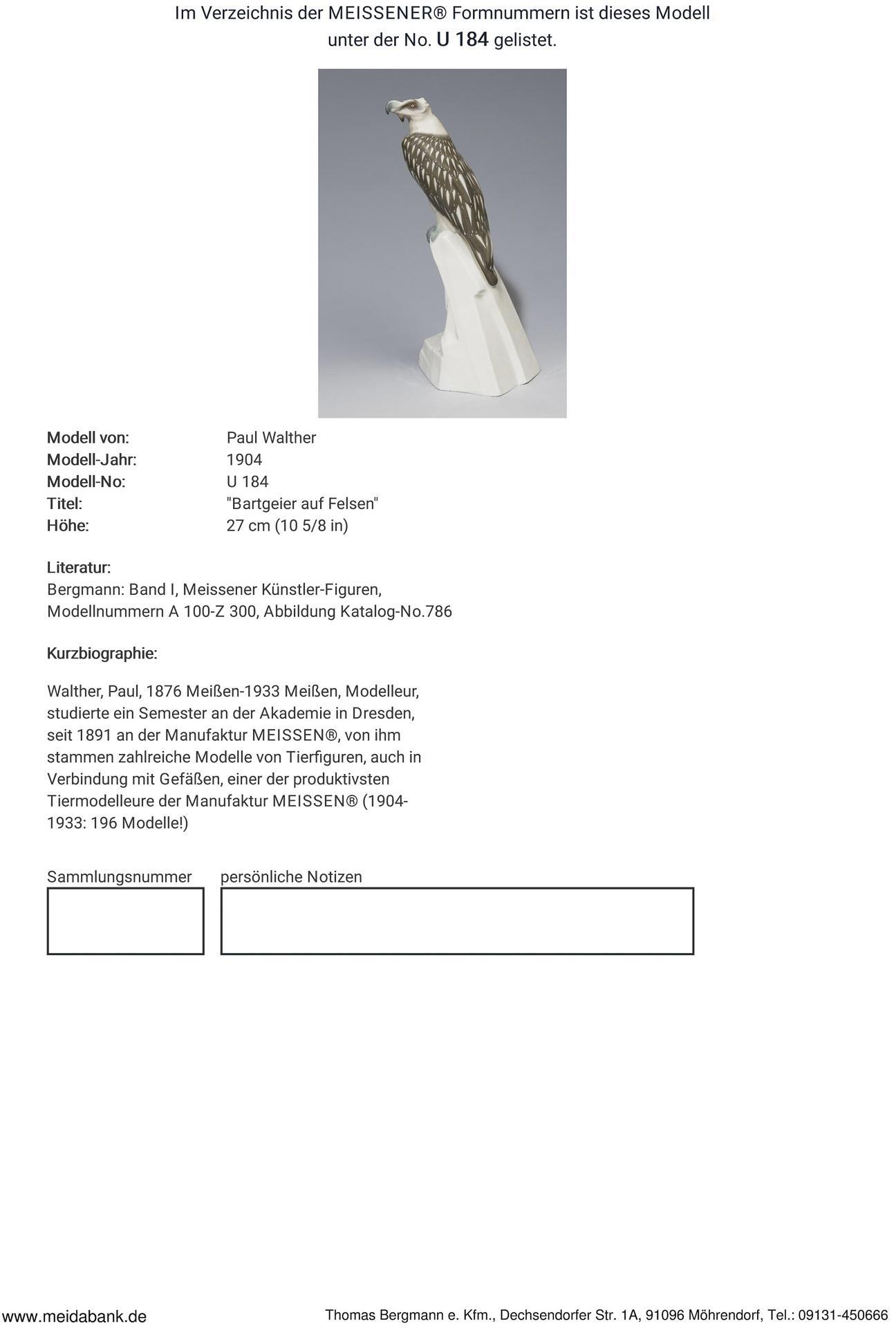 Walther, Modelleur, seit 1891 an der Manufaktur. Von ihm stammen zahlreiche Modelle von Tierfiguren, auch in Verbindung mit Gefäßen, einer der produktivsten Tiermodelleure * Partnerauktion Bergmann.