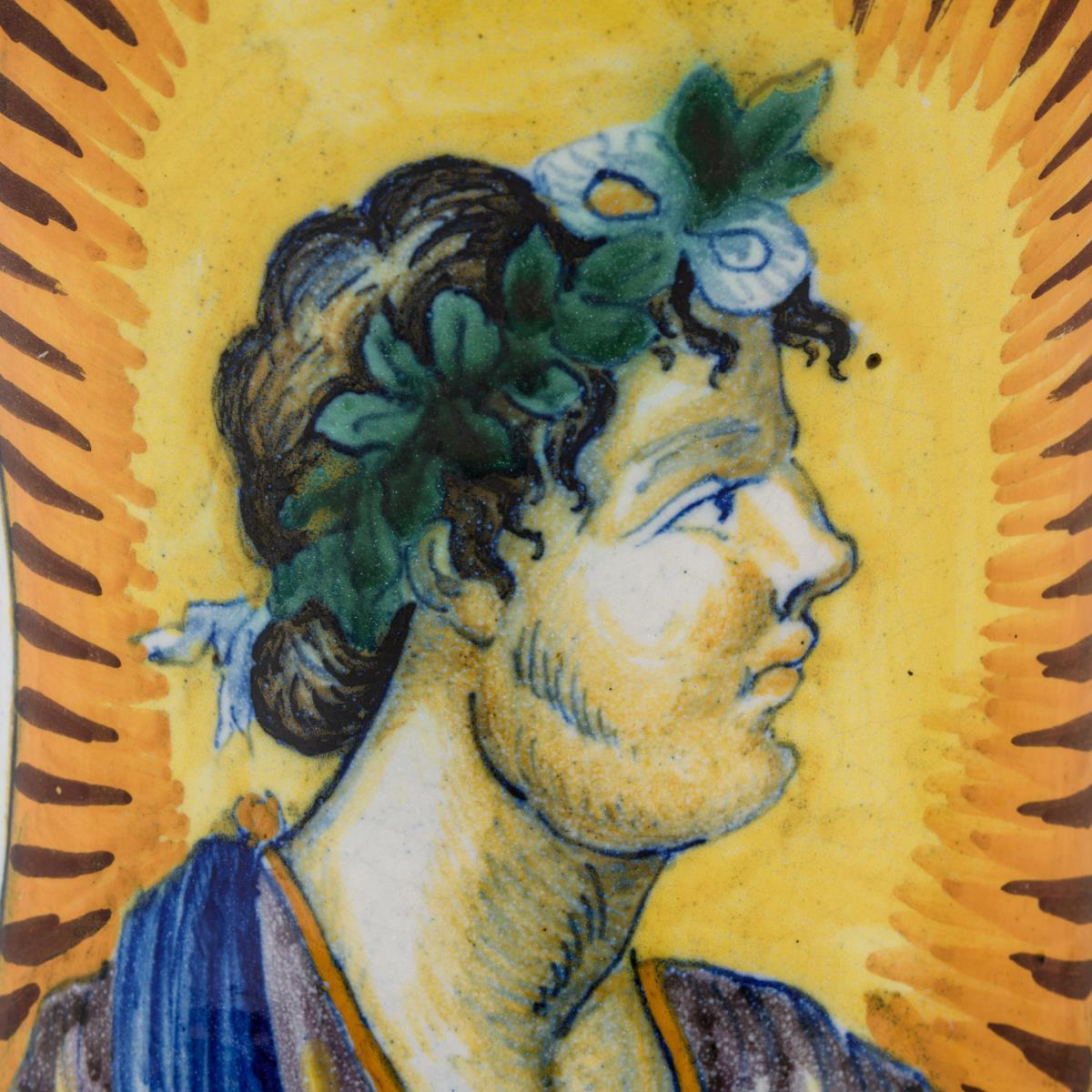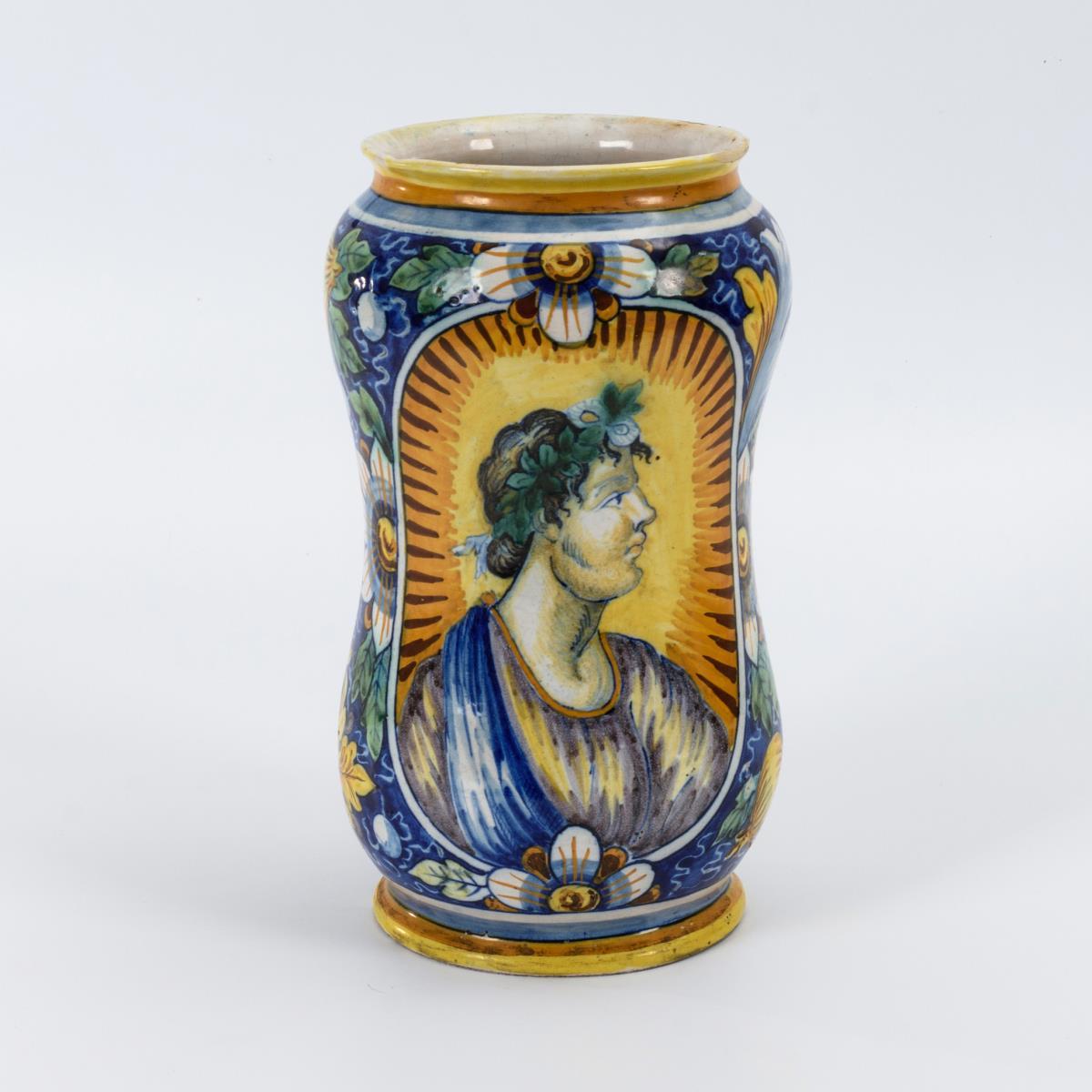 Zylindrisches Apothekergefäß. Schauseitig ein antikisierender Profilkopf, umgeben von Floraldekor. Partiell leichte Gebrauchsspuren, kleine Restaurierung am Rand.