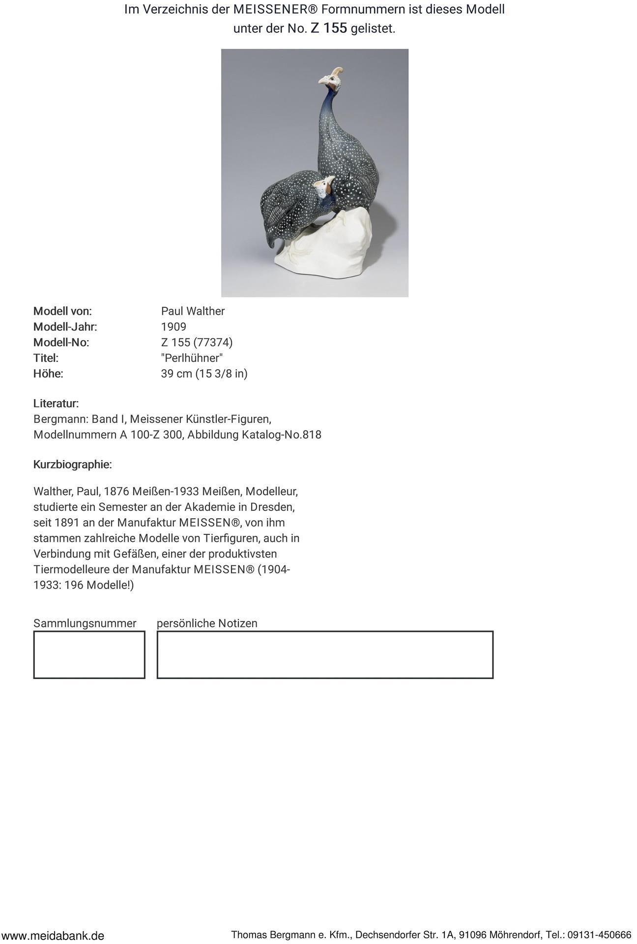Walther, Modelleur, seit 1891 an der Manufaktur. Von ihm stammen zahlreiche Modelle von Tierfiguren, auch in Verbindung mit Gefäßen, einer der produktivsten Tiermodelleure * Partnerauktion Bergmann.
