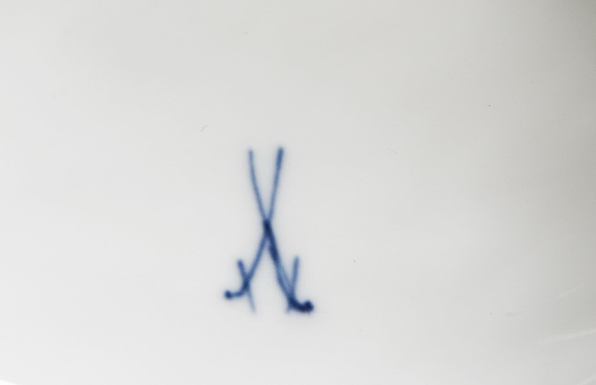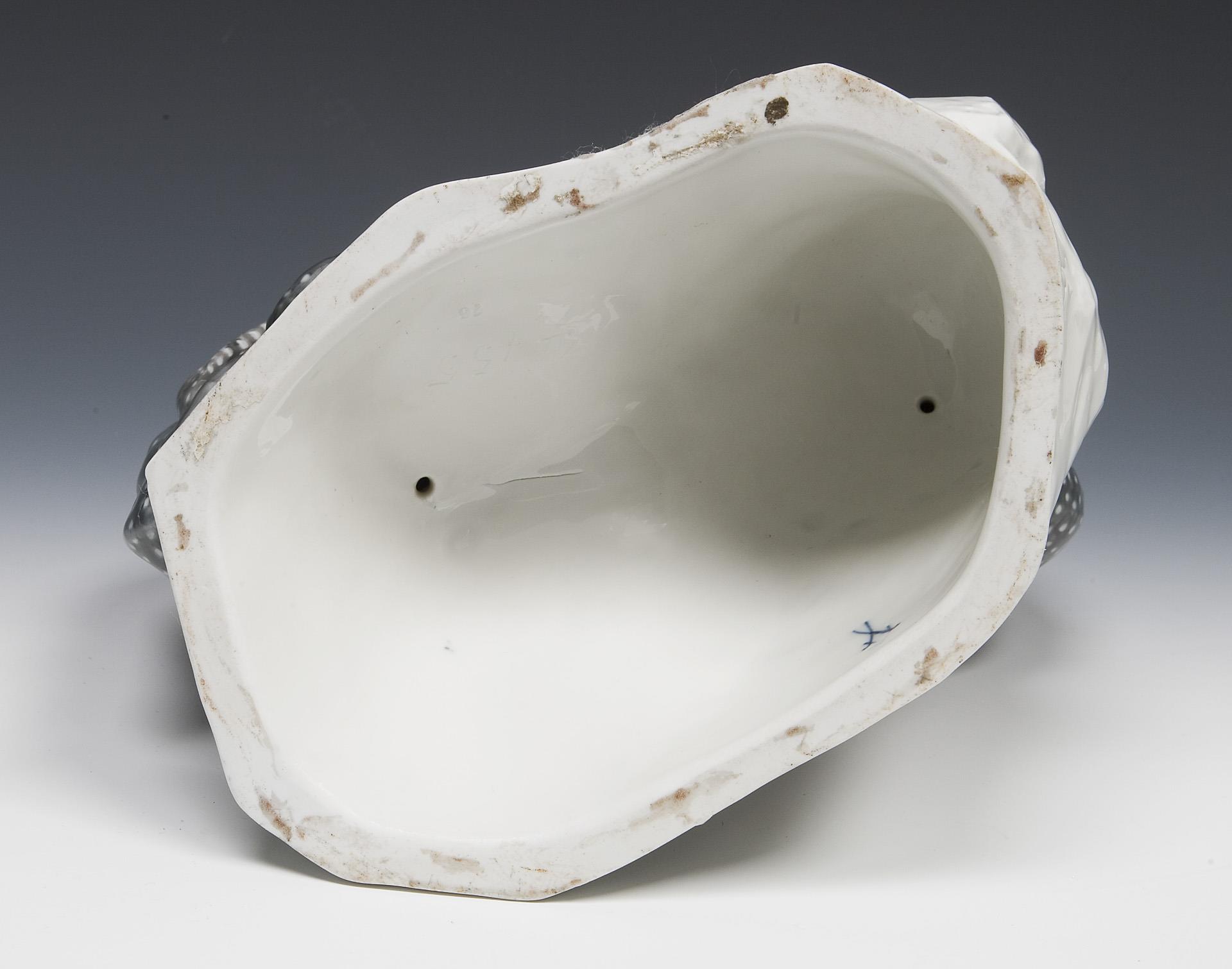 Modell-Jahr: 1909, naturalistisch bemalt, Ritzmarke, Pressmarke, Schwertermarke. Ein Brandriss an der Schwanzfeder, im Sockel drei Brandrisse.