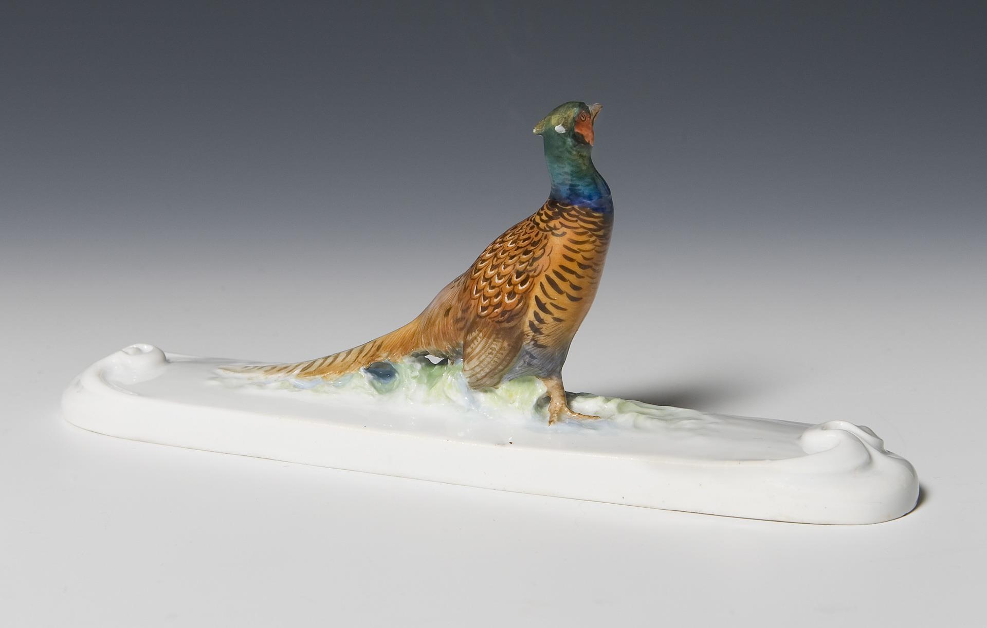 Jugendstil-Tierfigur: Fasan auf langem Postament. Meissen.