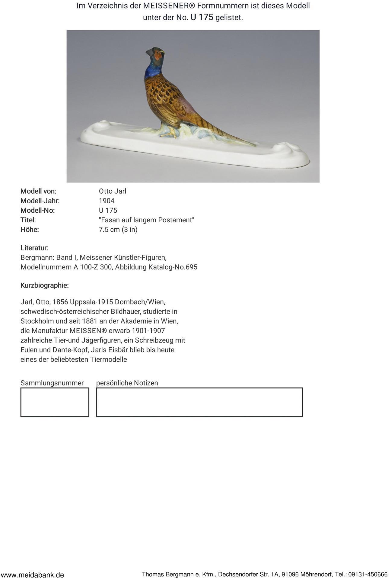 Modell-Jahr: 1904, naturalistisch bemalt, unglasierter Boden, Ritzmarke, Schwertermarke. Kopf partiell restauriert, eine Federohrspitze bestoßen.