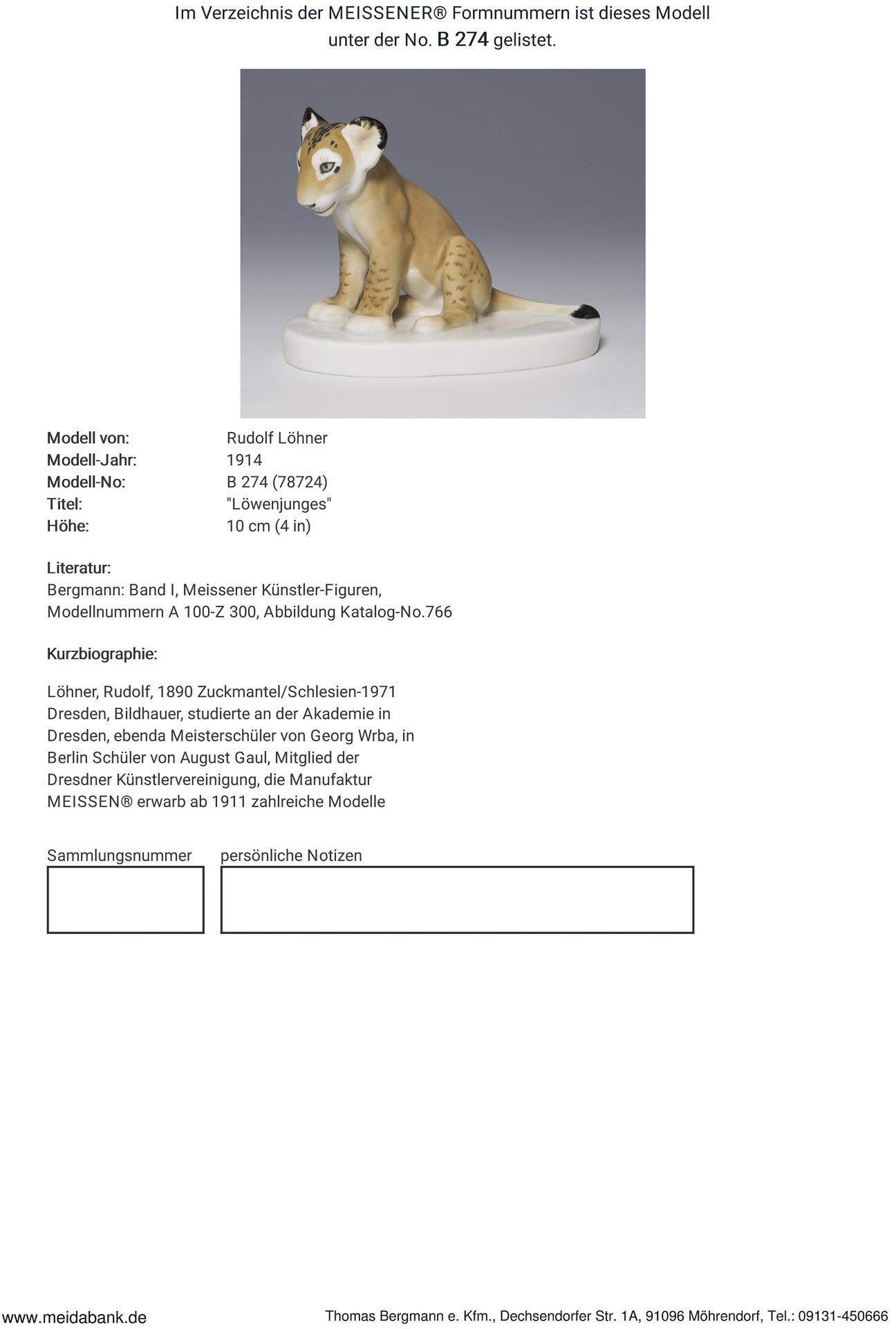 Löhner, Bildhauer, studierte an der Akademie in Dresden. In Berlin Schüler von August Gaul. Die Manufaktur erwarb ab 1911 zahlreiche Modelle. Meissen-Manufaktur-Preis: 2290,- Euro * Partnerauktion Bergmann.