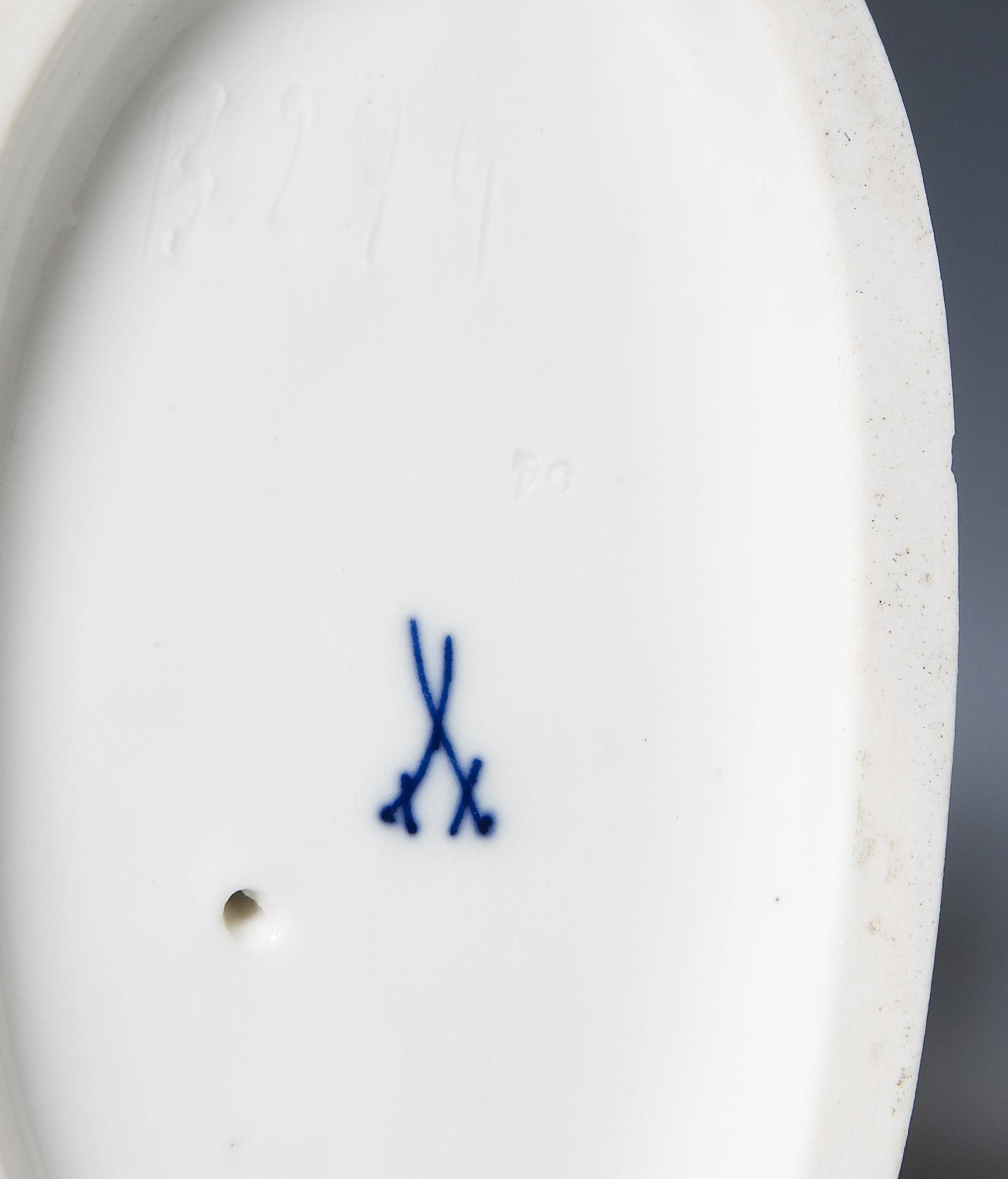 Modell-Jahr: 1914, naturalistisch bemalt, Ritzmarke, Pressmarke, Malermarke, Schwertermarke. Am Schwanz restaurierter Riss, kleiner Haarriss im Sockel, Sockelrand leicht bestoßen.