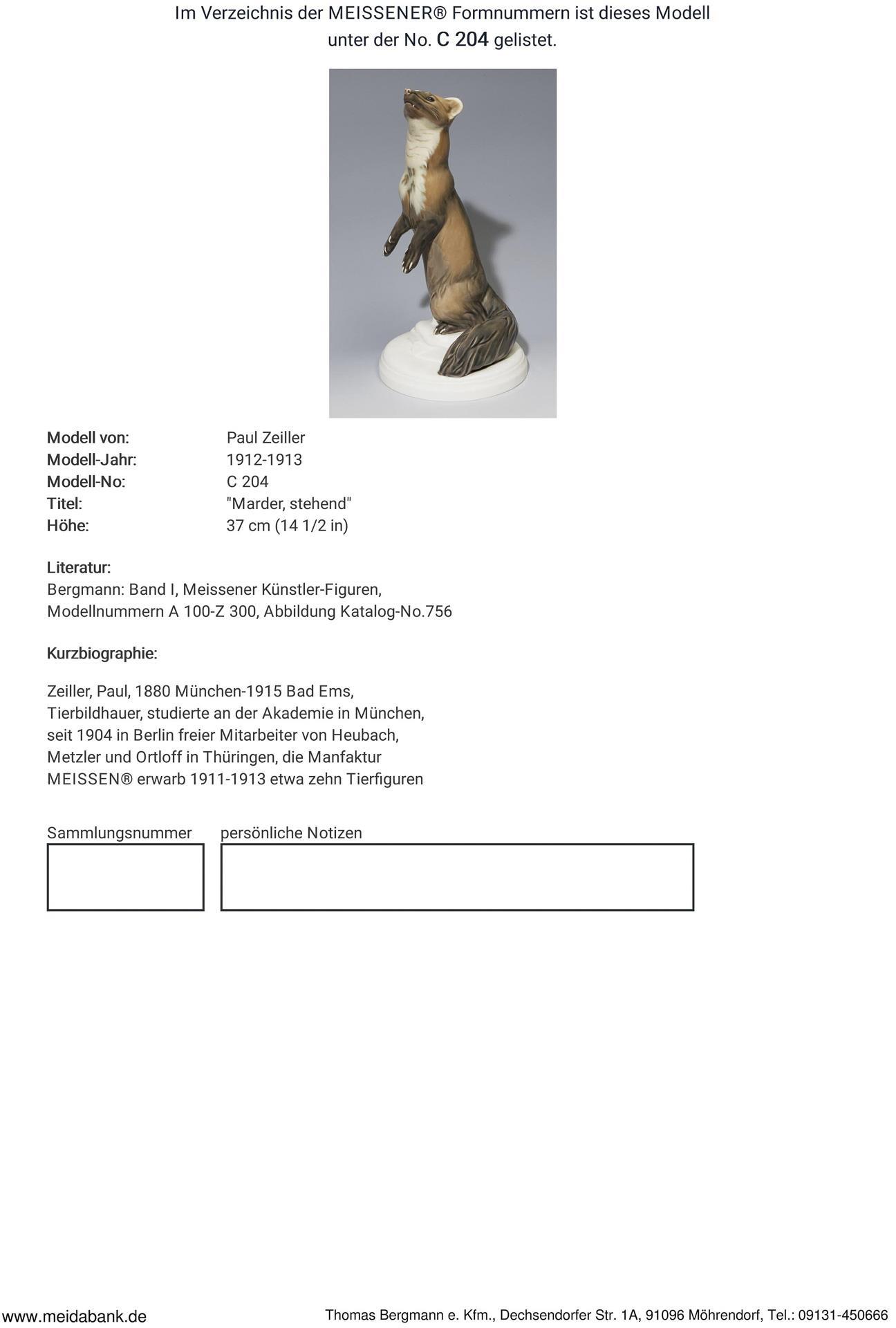 Zeiller, Tierbildhauer, studierte an der Akademie in München. Seit 1904 in Berlin freischaffend tätig. Die Meissener Manufaktur erwarb 1911-1912 mehrere Tierfiguren * Partnerauktion Bergmann.