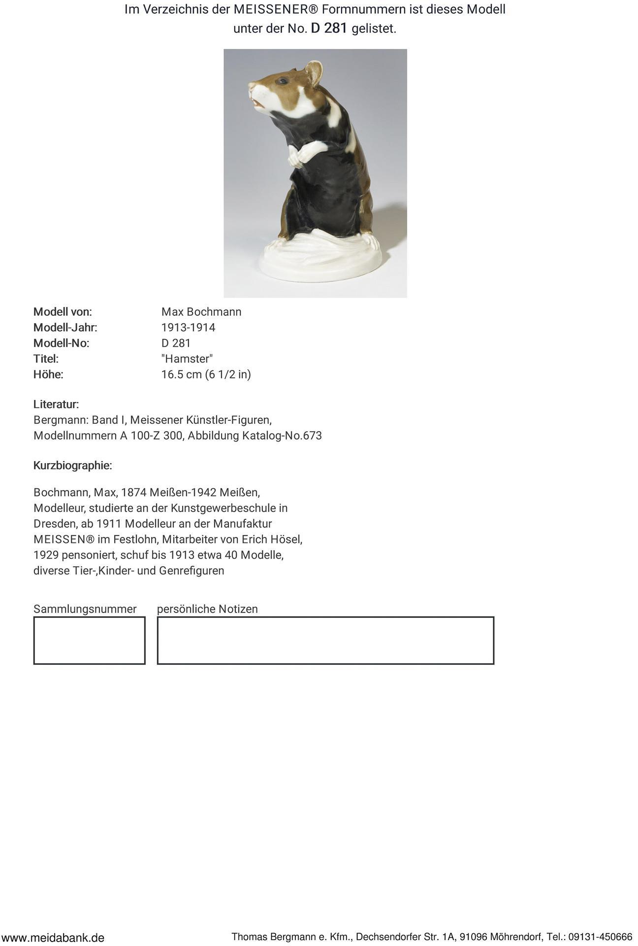 Bochmann, Modelleur, studierte an der Kunstgewerbeschule in Dresden, ab 1911 Modelleur an der Manufaktur im Festlohn, Mitarbeiter von Erich Hösel, 1929 pensioniert * Partnerauktion Bergmann.