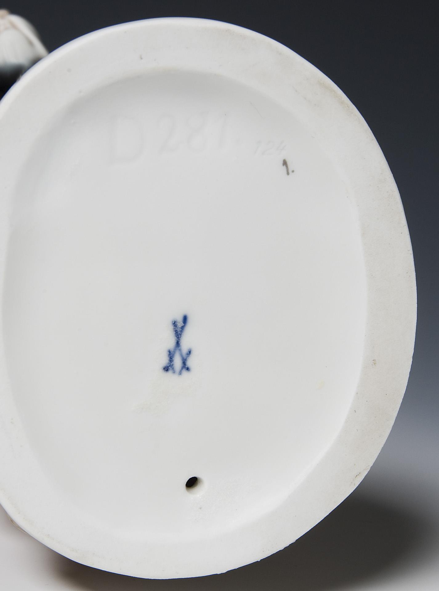 Modell-Jahr: 1913-1914, naturalistisch bemalt, Ritzmarke, Pressmarke, Malermarke, Schwertermarke, Künstler-Signet. Sockelrand von unten minimal bestoßen.