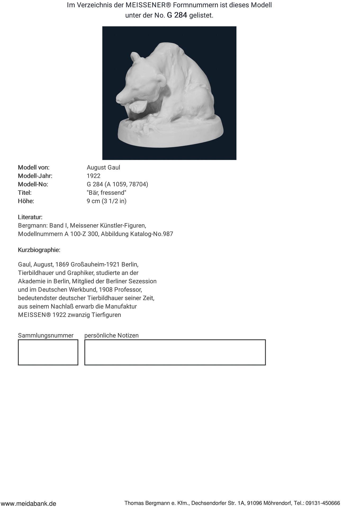 Gaul, Tierbildhauer und Graphiker, studierte an der Akademie in Berlin. Meisterschüler von Reinhold Begas, 1908 Professor. Bedeutendster deutscher Tierbildhauer seiner Zeit. Meissen-Manufaktur-Preis: 499,- Euro * Partnerauktion Bergmann.