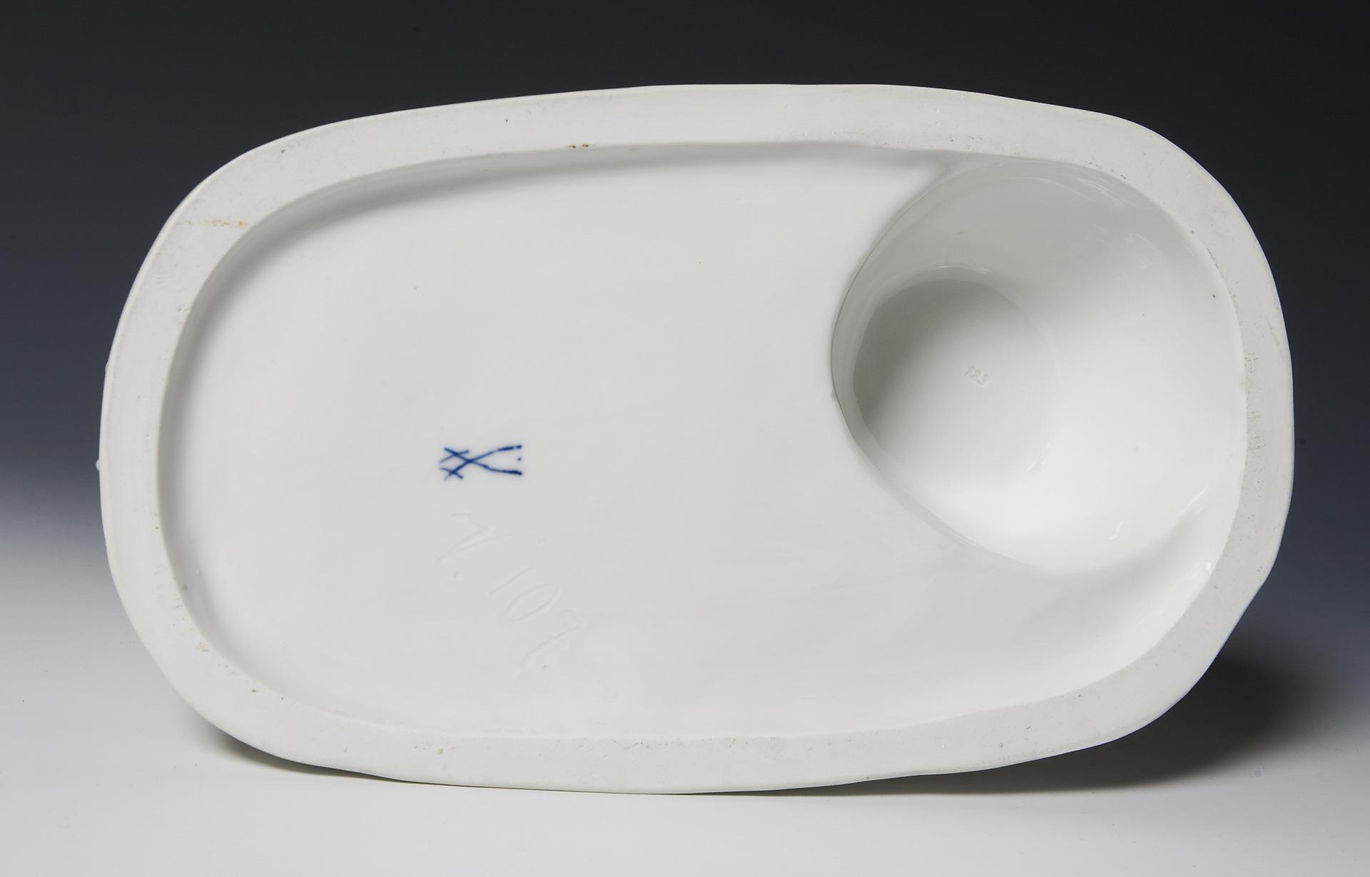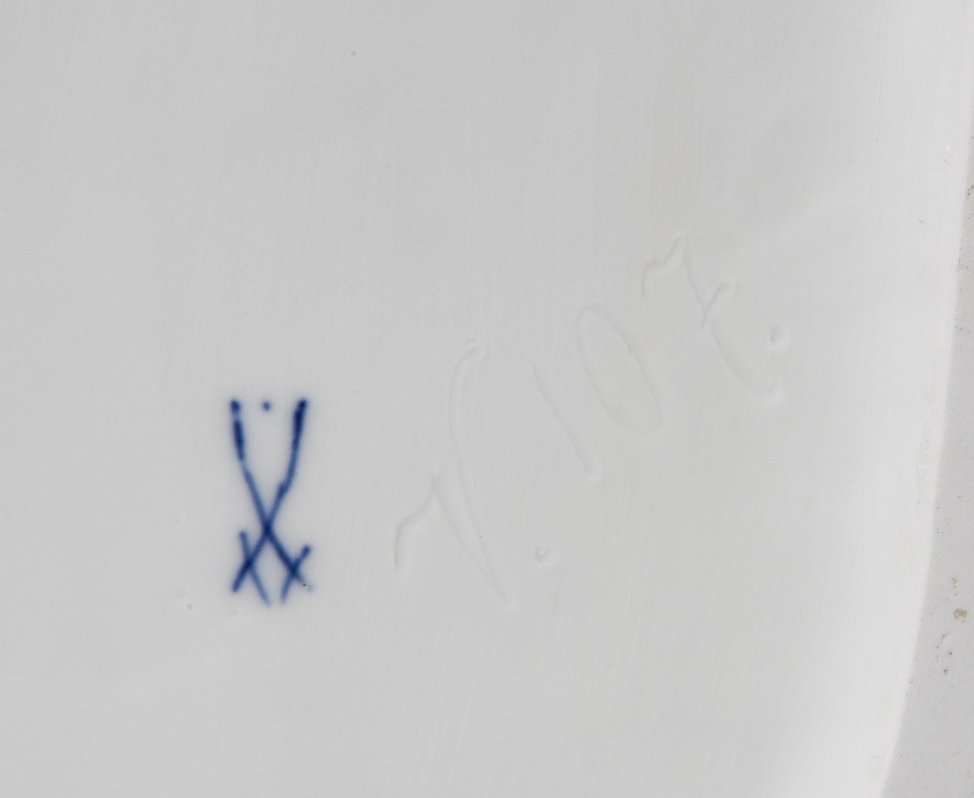 Modell-Jahr: 1904, farbig staffiert, Napf mit kobaltblauer Unterglasurmalerei. Ritzmarke, Pressmarke, Malermarke, Schwertermarke mit Punkt, Künstler-Signet. Im Sockel kleiner Brandriss.