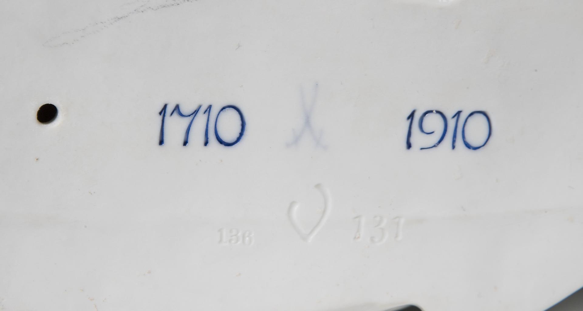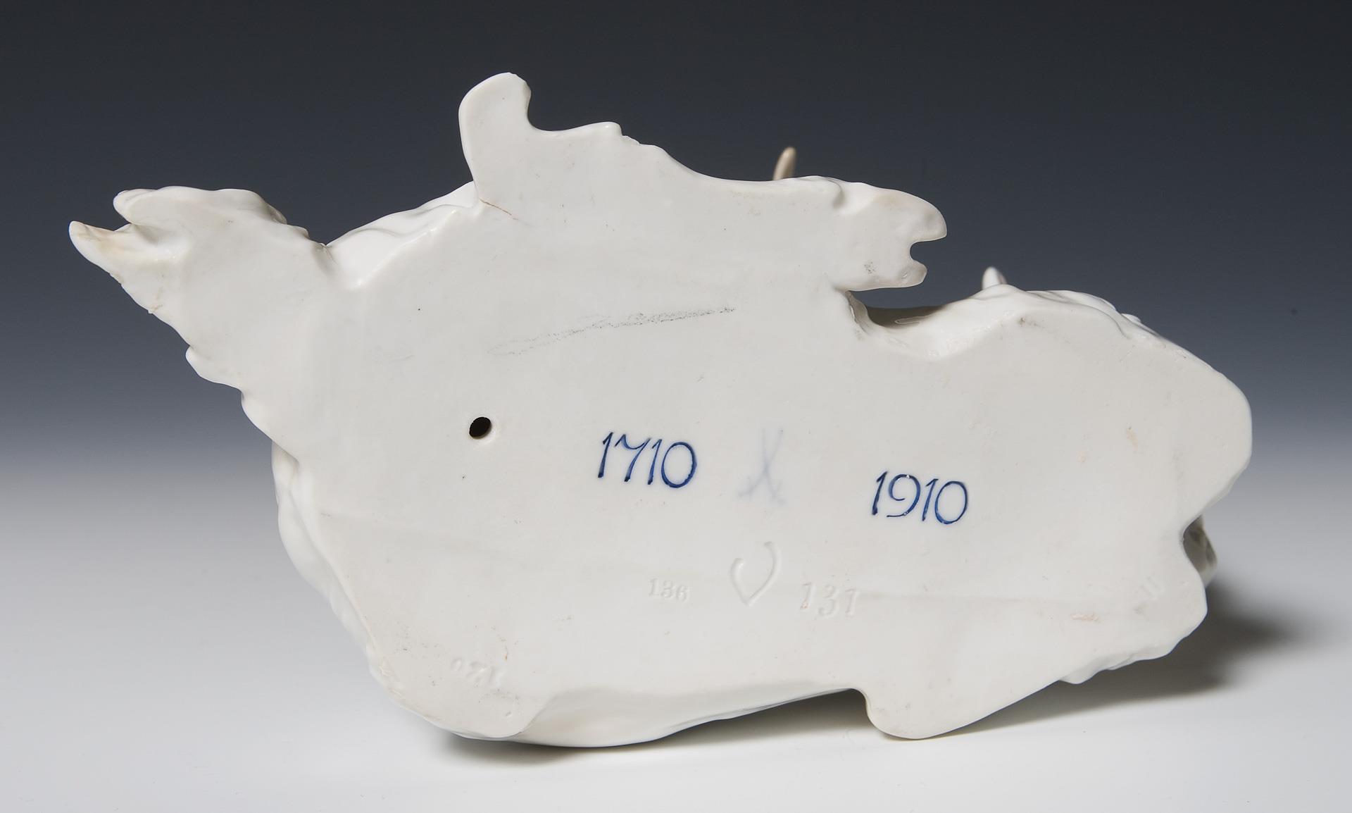 Modell-Jahr: 1909, farbig staffiert, unglasierter Boden, Ritzmarke, Pressmarke, Schwertermarke, Jubiläumsmarke 1710-1910. Im Boden kleiner Brandriss, Schwanz minimal bestoßen.