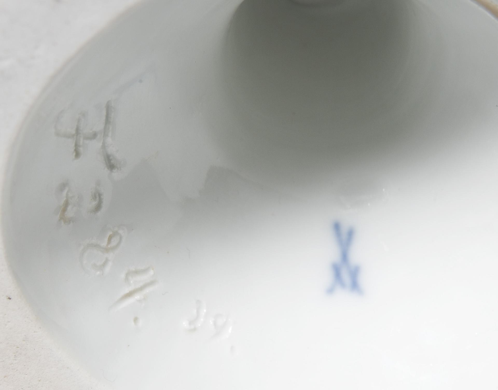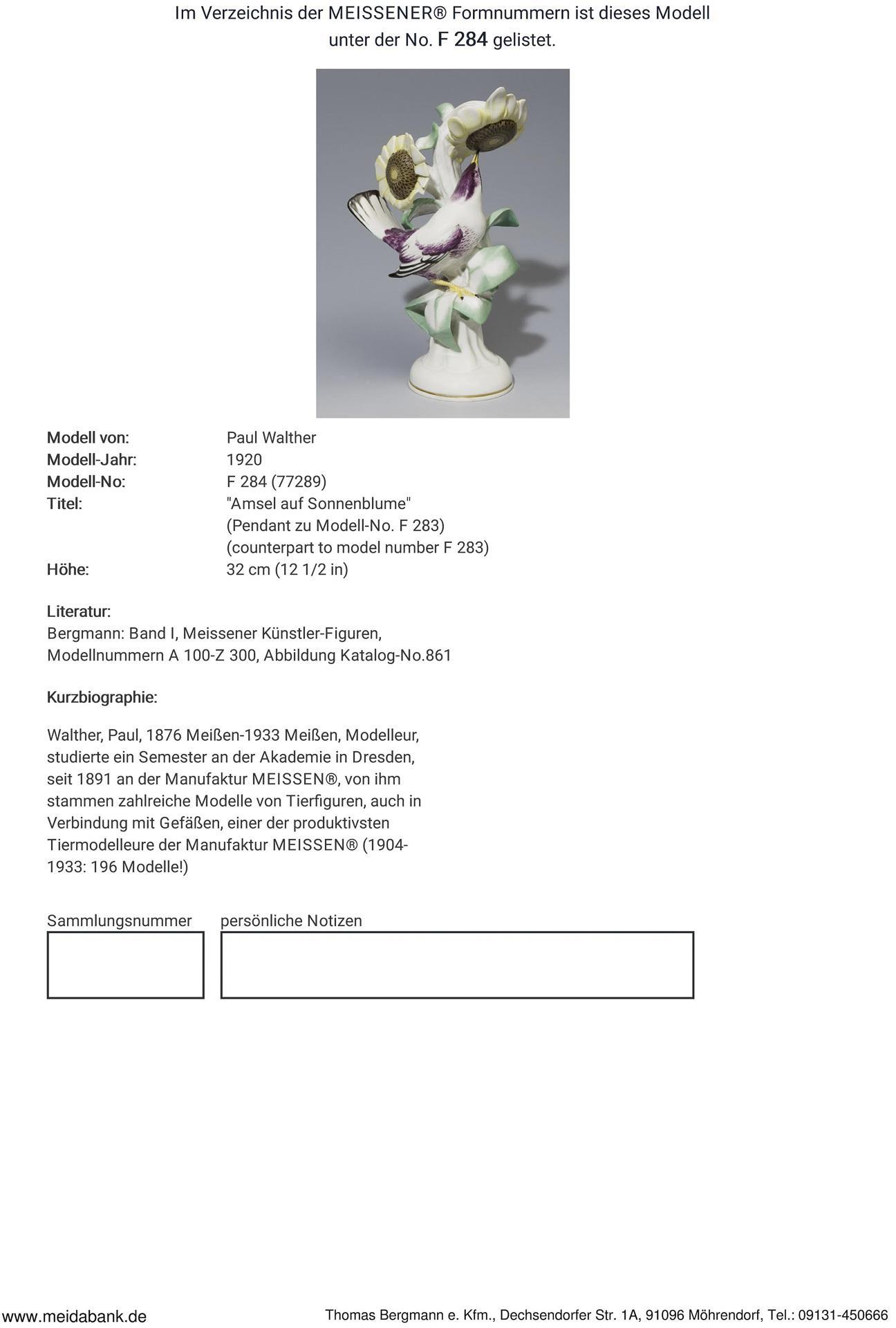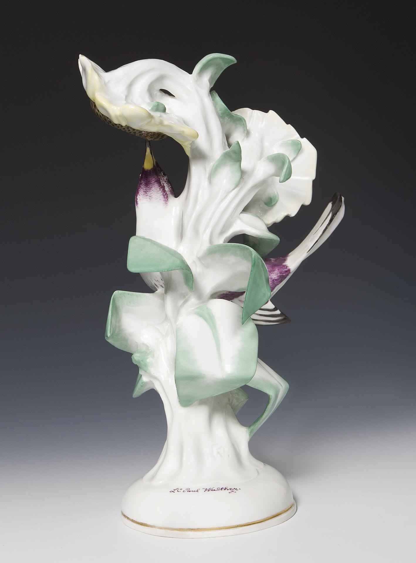 Modell-Jahr: 1920, farbig bemalt, gold staffierter Rand. Ritzmarke, Pressmarke: von 11 Urstücken Nr. 5, Schwertermarke, Künstler-Signet PW, handschriftliches Künstler-Signet: L C. Paul Walther (Louis Clemens Paul Walther). 1918 wurde die Herstellung von Urstücken (Künstler-Exemplare) eingeführt. Die Ausformung und Staffierung dieser Exemplare wurde vom Künstler selbst überwacht oder nochmals überarbeitet. Daher sind Urstücke meist vom Künstler in Überglasurfarbe signiert. Eine Blattspitze, Schwanzfeder, ein Flügel restauriert.