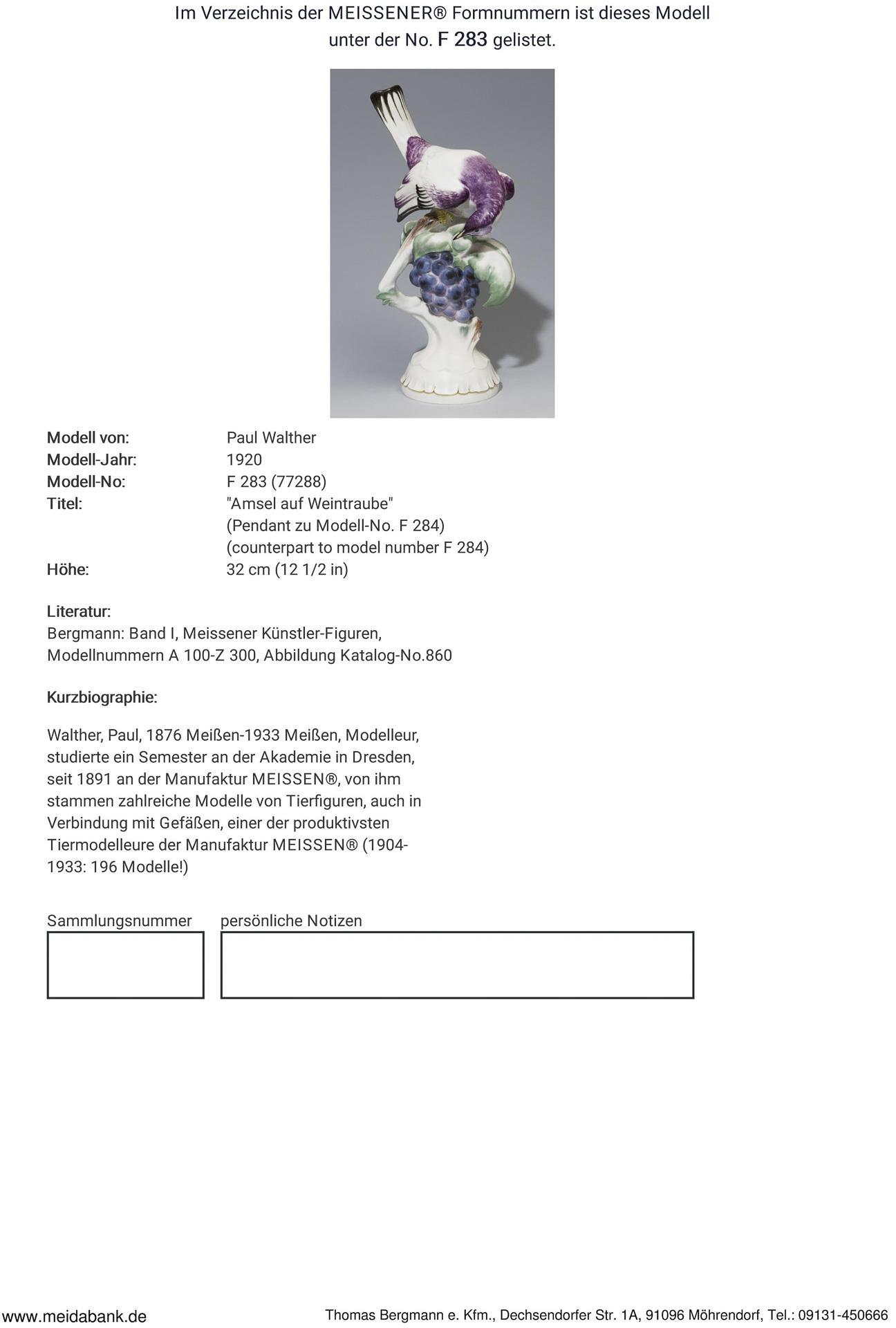 Walther, Modelleur, seit 1891 an der Manufaktur. Von ihm stammen zahlreiche Modelle von Tierfiguren, auch in Verbindung mit Gefäßen, einer der produktivsten Tiermodelleure * Partnerauktion Bergmann.